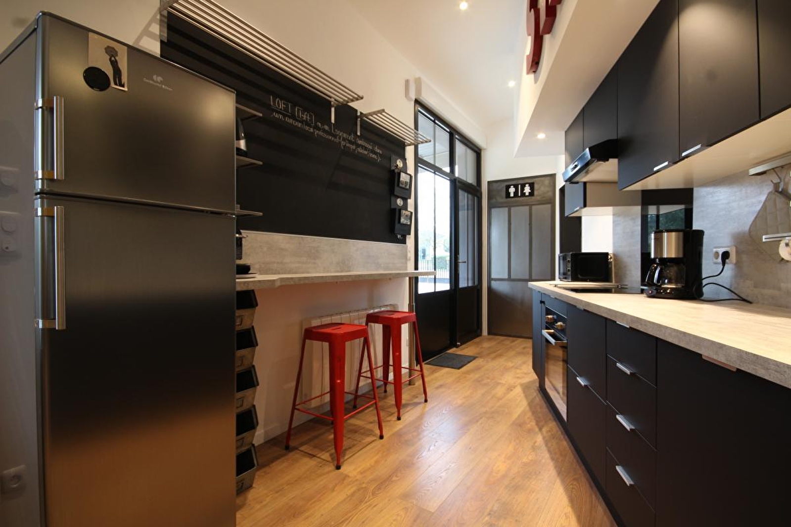 Dans un ancien atelier de garagiste entièrement réhabilité, à proximité des propriétaires, ce gîte indépendant, sur un terrain clos de 600m², dévoile son nouveau visage : une atmosphère contemporaine et industrielle, tout en étant chaleureuse et cosy. Loft de plain-pied : séjour avec cuisine équipée ouverte sur l'espace repas et le coin-salon (poêle-cheminée, TV écran plat, lecteur DVD, chaîne hifi), 2 chambres climatisées (2 lits 80cm jumelables / 1 lit 160cm, TV et mezzanine avec couchage d'appoint pour 1 enfant), salle de douche, WC indépendants. Wifi. Jardin, cour, terrasse abritée, terrain de pétanque (boules sur place), plusieurs salon de détente, brasero, 2 barbecues. Table de ping-pong accessible chez les propriétaires. Parking fermé. Vélos à disposition : 2 adultes et 4 enfants. Possibilité de pêcher dans l'étang familial privé à 1 km. Lit bébé, chaise haute et baignoire bébé sur demande.