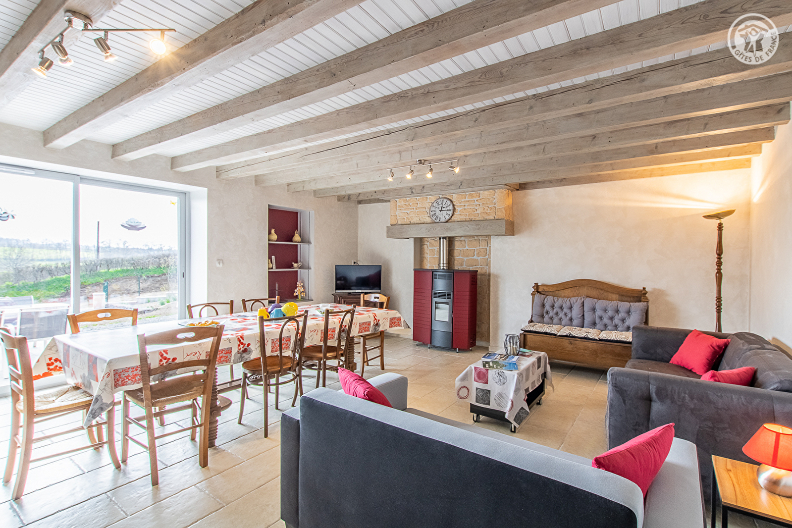 Delphine vous accueille au sein d'une authentique ferme morvandelle traditionnelle du début 19ème siècle intégralement restaurée et réhabilitée en confortable villégiature, pétrie d'histoire familiale & personnelle (« maison de famille » depuis toujours, ancienne demeure de son arrière-grand-mère). Environnement calme, au sein d'un mini hameau rural familial blotti en pleine campagne vallonnée au creux de la verdoyante vallée de l'Arroux (bucolique rivière poissonneuse qui coule à deux pas), en lisière immédiate de bocage accueillant les célèbres paisibles vaches charolaises en saison en guise de voisines ultra privilégiées. Apaisant cadre champêtre & naturel préservé jouxtant plusieurs grands étangs et de vastes massifs forestiers sauvages à découvrir lors de promenades à pied ou en VTT. A 8.5 km du centre du centre du petit bourg typique d'Uxeau niché au pied du Mont Dardon culminant à 506 mètres d'altitude, exceptionnel belvédère & ancien oppidum gaulois offrant une spectaculaire vue panoramique sur les hauts lieux de la Bourgogne du sud comme les montagnes du Mont Beuvray, Uchon ou le Mont Saint-Vincent et jusqu'au Mont Blanc par temps clair (avec table d'orientation dédiée). Spacieux gîte de bon confort. Grande pièce de vie. Chaleureux cachet campagnard aux accents contemporains. Ambiance zen et douce. Équipement complet de qualité. Large terrasse au sud (abritée & ombragée sous pergola) ouverte sur un agréable jardin clos végétalisé & fleuri, dominant les pâtures voisines. Belle vue dégagée sur la douce campagne environnante.