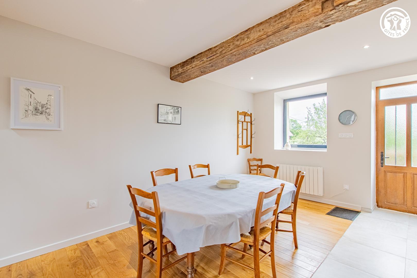 Composition : Maison mitoyenne à dépendance agricole jouxtant maison propriétaires (totale indépendance). Wifi (fibre). Chauffage électrique. Rdc surélevé : séjour-cuisine-salon. 1er étage : espace bureau (mezzanine palière), 3 chambres (3 lits 1 p. 90x190cm dont 2 superposés / lit 2 p. 160x200cm / lit 2 p. 160x200cm) dont une avec salle d'eau privée (douche/Wc), salle de bain (baignoire + douche + Wc). Terrasse + jardin (400m² avec table ping-pong) + parking privés. Supermarché à 1 km. Commerces 1.5 km.