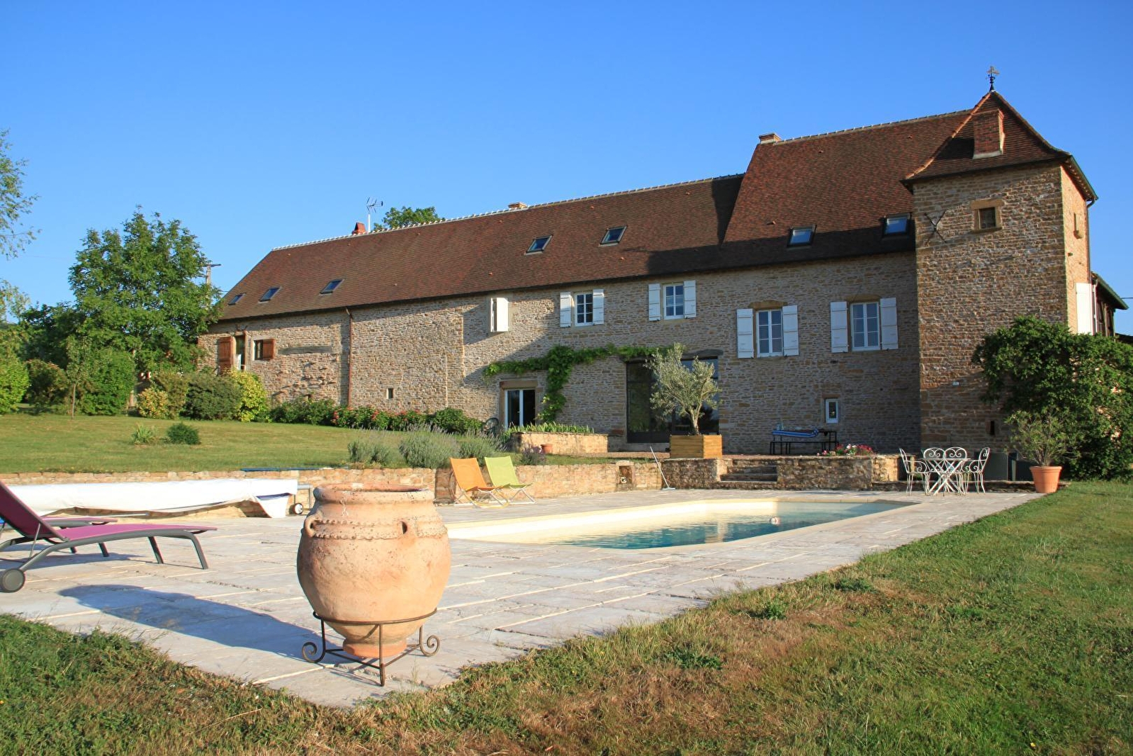 Spécialisée dans l'enseignement de l'équitation auprès des enfants, Laurence & Nicolas vous accueillent au sein d'un authentique corps de ferme de caractère du XVI siècle chargée d'histoire, restauré avec soins (jadis lié aux célèbres seigneurs de Brancion). Calme absolu au creux d'un écrin champêtre préservé, dominant une bucolique plaine de bocage, rivières & prairies, sur les contreforts des collines boisées du massif sud Bourgogne (territoire naturel protégé parsemé de nombreux chemins de randonnées & splendides point de vue) jouxtant le pittoreque petit village typique d'Etrigny & son riche patrimoine. Au sein d'une vaste propriété familiale de 15 ha abritant une école d'équitation « poney-club » dédiée aux enfants de 2 à 12 ans & une insolite ferme découverte uniquement dotée d'espèces « miniatures » très dociles (« mini » vaches, cochon, moutons, chèvres, ânes, lapins…). Nombreuses activités découverte de la nature, des animaux & de l'équitation sur place. Superbe panorama & paysages. Spacieux gîte de bon confort. Chaleureux cachet campagnard. Restauration patrimoniale soignée (plafond, poutres, cheminée… d'origine). Charmante ambiance dépaysante d'une ancienne demeure. Ravissant spacieux jardin intimiste clos - arboré, fleuri & végétalisé - doté d'une large terrasse (exposé & ombragée) lové en lisière de prairie. Agréable balcon abrité.