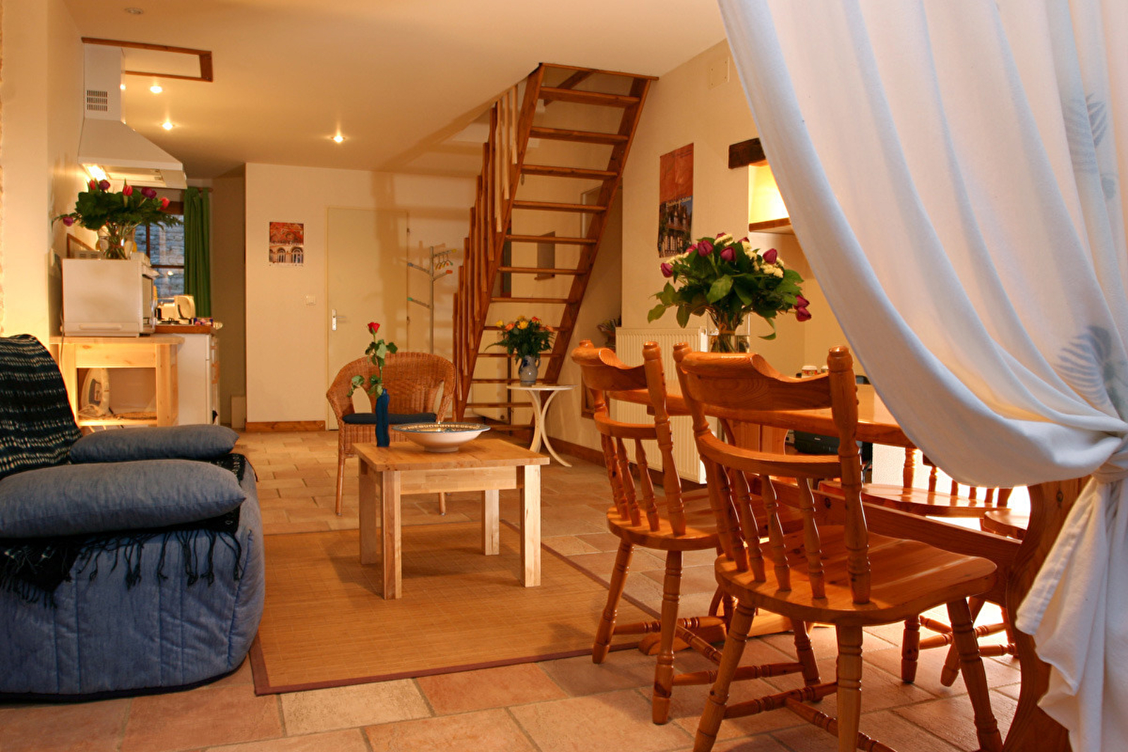 Composition : Maison mitoyenne au bureau professionnel des propriétaires, voisinant leur maison (totale indépendance sans vis-à-vis). Wifi (fibre). Chauffage central gaz. Étage climatisé. Rdc : séjour-cuisine-salon (canapé convertible 1 p. 120x190cm en appoint), Wc indépendant. 1er étage : 2 chambres (lit 2 p. 140x190cm / 2 lits 1 p. 80x190cm), salle d'eau (douche). Jardinet clos (50m²) + parking privés. Local vélos. Commerces dont supermarché 3 km. Recharge véhicule électrique/hybride uniquement sur demande auprès du propriétaire
