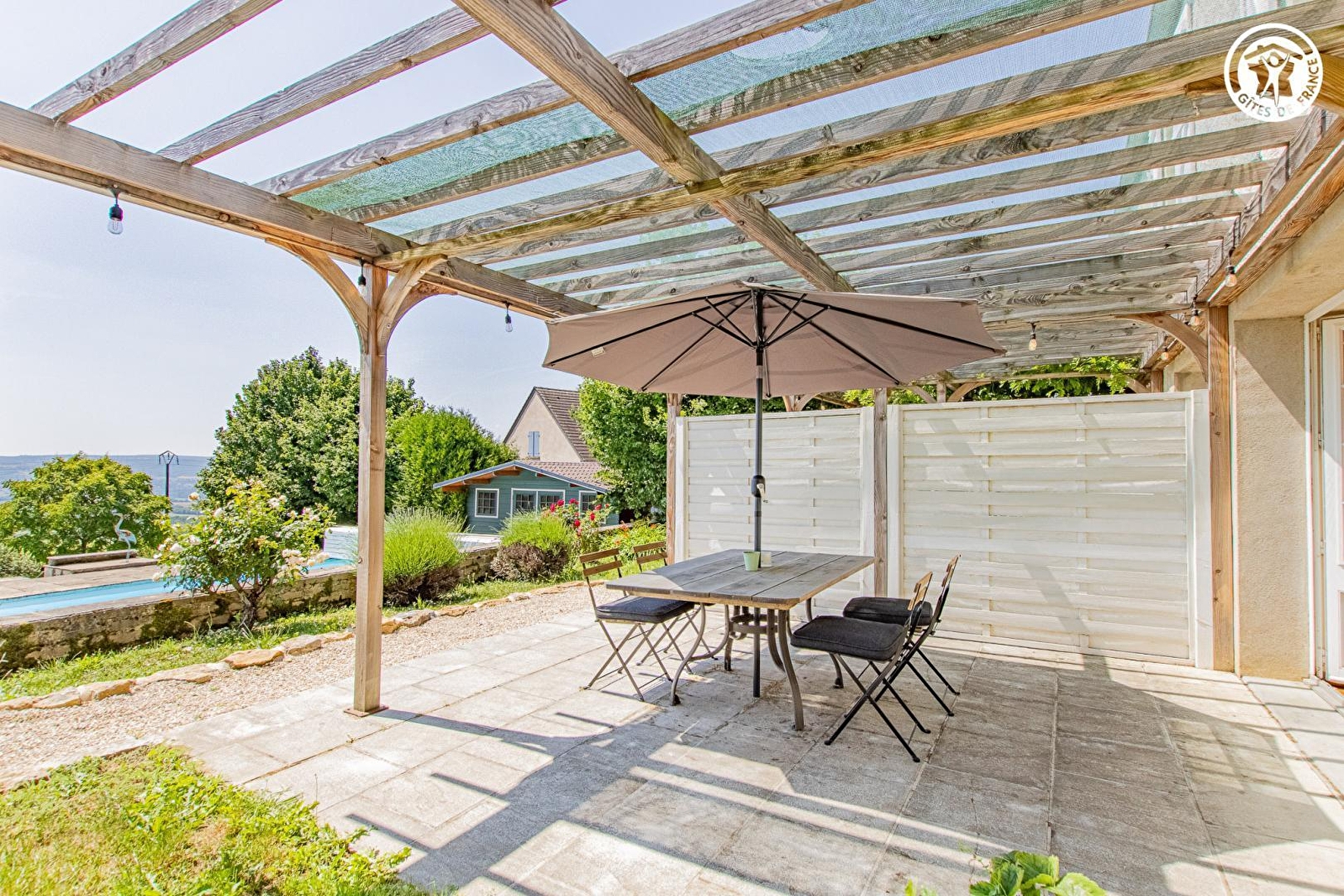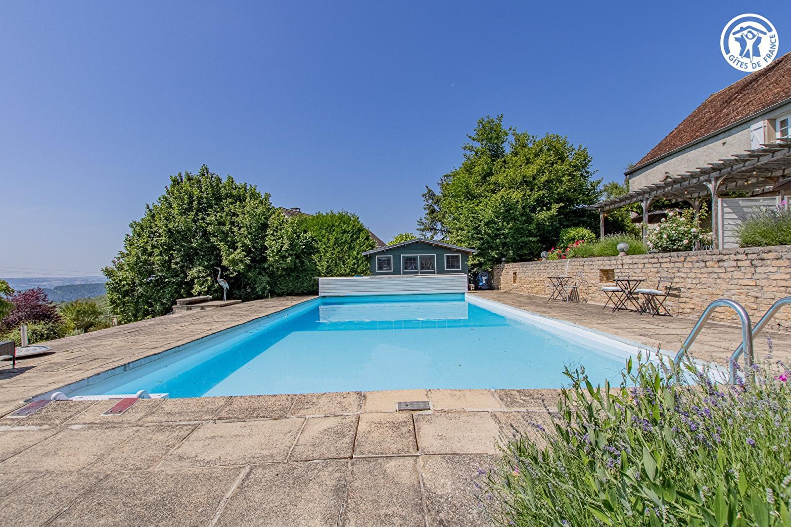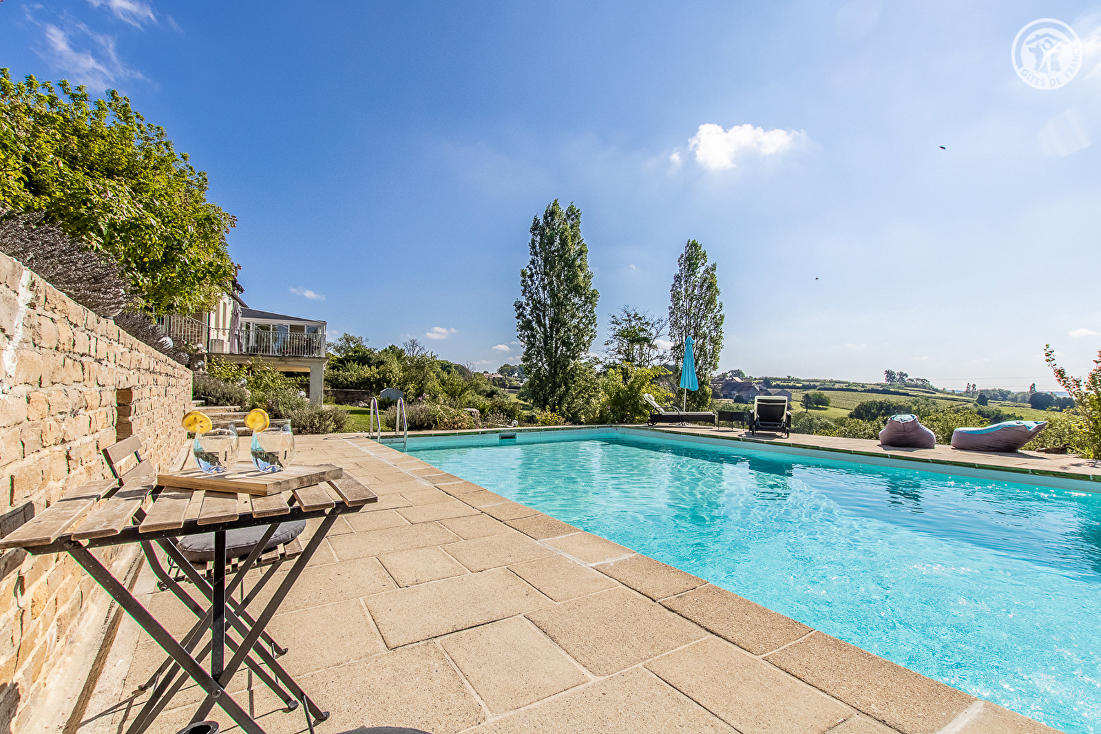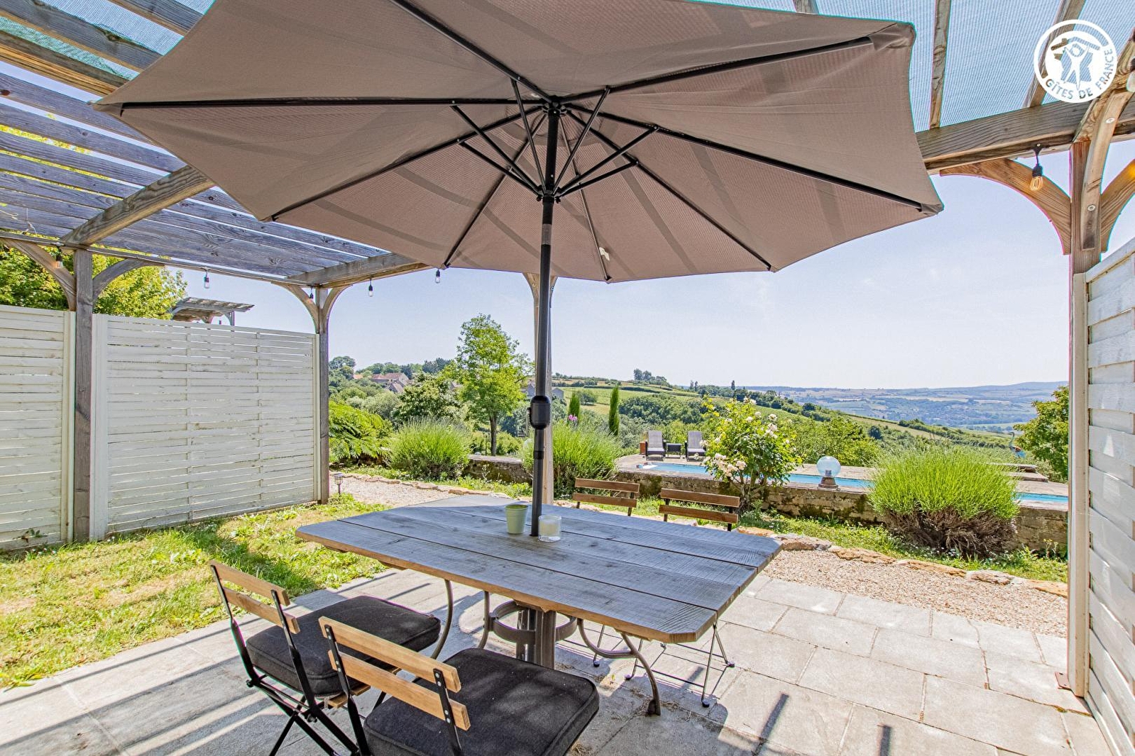 Authentique grange traditionnelle de caractère du XIXe soigneusement restaurée, lovée "en balcon" & "belvédère panoramique" à flanc de coteau sud, en lisière de vignobles. Calme & totale tranquillité, blotti au bout d'une intimiste impasse, au cœur d'un paisible petit village viticole typique juché sur une colline au pied du Mont Rome (point culminant du territoire avec 546m, site d'escalade réputé & belvédère unique pour son exceptionnelle vue s'étendant de la Saône à l'Autunois). En pleine campagne chalonnaise vallonnée, niché entre les bucoliques vignobles du Couchois & des Maranges, au creux d'un ravissant écrin champêtre & naturel préservé de coteaux de vignes, prairies & collines boisées. Gîte de très bon confort. Chaleureuse ambiance "campagne chic" sublimée par l'âme du bâti d'origine (exceptionnel sol en pierres, poutres, niches avec linteaux en pierres…). Beaucoup de charme & caractère. Très cosy. Large terrasse panoramique ombragée. Belle propriété de 4500m² (en commun) pétrie d'histoire (jadis domaine viticole), soigneusement végétalisée & fleurie, comprenant un espace engazonné (avec balançoire), une belle piscine (5x10m), un terrain de pétanque, une table de ping-pong & une agréable prairie "naturelle" abritant un verger fruitier avec chemin de promenade (cerisier, figuier, pommiers, poiriers, noyers…). Sublime panorama sur les vignobles & la campagne environnante. Magnifiques paysages.