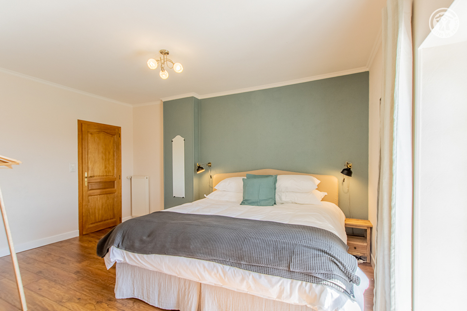 Composition : Maison comprenant 2 gîtes mitoyens (indépendance totale) sur une propriété abritant un troisième gîte et la résidence secondaire des propriétaires. Wifi (fibre). Chauffage PAC. Lave-linge en commun dans buanderie au sous-sol. Rdc : cuisine, séjour-salon (canapé convertible 2 p. 140x200cm), Wc indépendant. 1er étage : 1 chambre (2 lits 1 p. 100x200cm jumelables en lit 2 p. 200x200cm), sdb (baignoire/Wc). Terrasse privative. Terrain en commun (4500m²) avec piscine (5x10m) & balançoire. Local vélos en commun. Parking privé. Commodités dont supermarché 8 km.