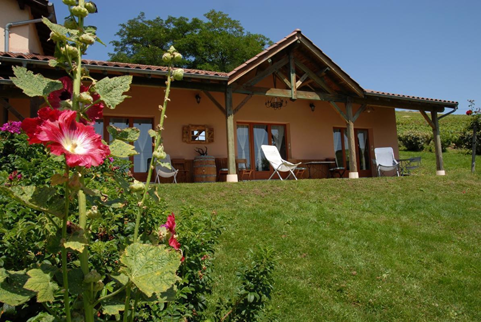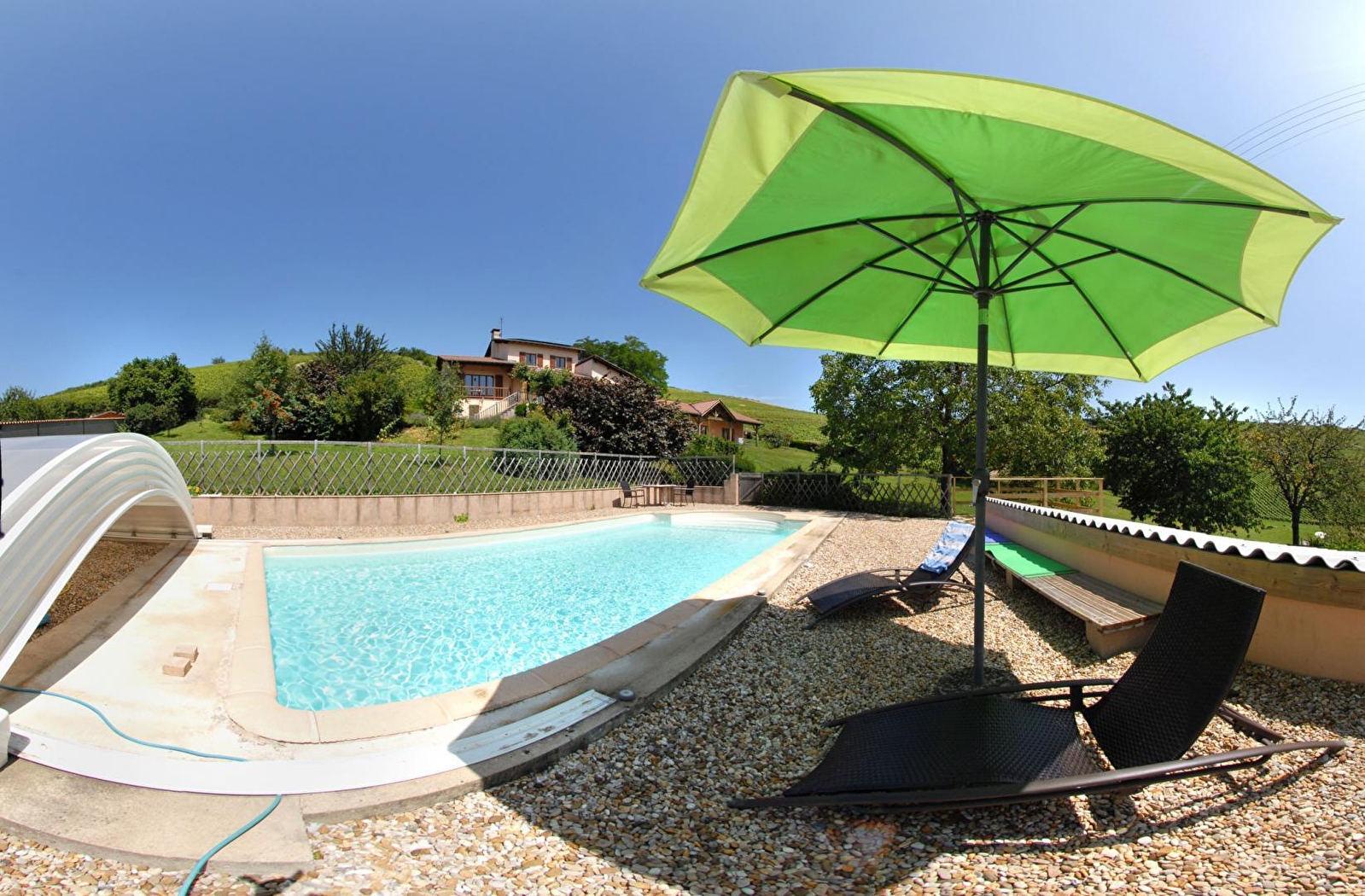 Passionnés de randonnée, de vélo, jardinage et nature, Christian et Catherine vous accueillent dans leur confortable gîte aménagé au sein d'une maison contemporaine de pays, lovée en plein cœur du splendide vignoble de l'appellation « Juliénas ». Secteur résidentiel calme sis à flanc de coteau sud exposé, au creux d'un splendide vallon, en toute bordure du charmant village viticole pittoresque de Pruzilly niché en balcon sur un col (450m d'altitude). Exceptionnel belvédère dominant le Val de Saône et la Bresse face aux massifs des Alpes et du Vercors offrant un magnifique point de vue (on y aperçoit le Mont-blanc par temps clair !). Cadre et site préservés absolument magiques et enchanteurs entre vignobles et forêts. Panorama et paysages littéralement somptueux. Gîte de bon confort. Chaleureux cachet campagnard. Large terrasse privative en partie abritée (exposée et ombragée). Agréable jardin aménagé & fleuri avec verger et double potager, disposant d'une belle piscine (9x4.5m) et d'une table de ping-pong.