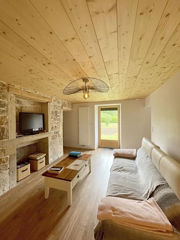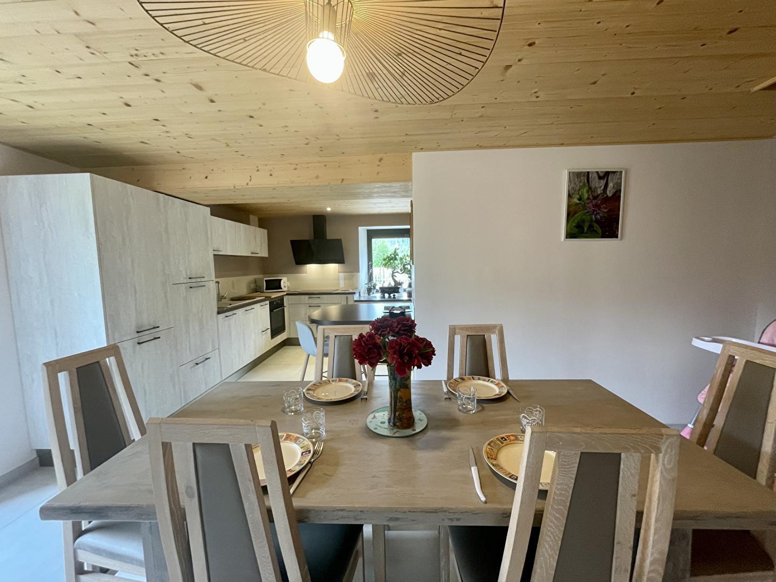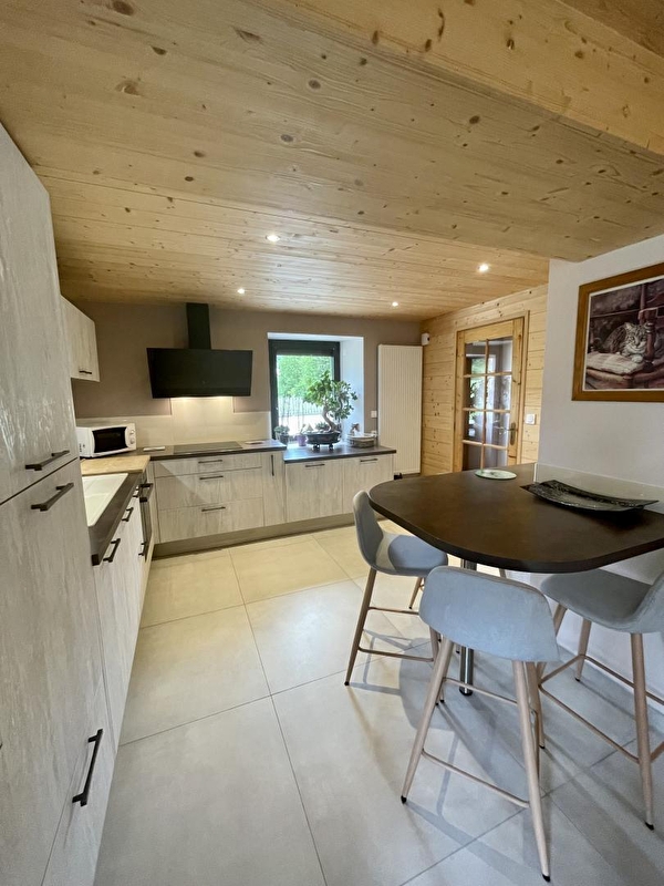Gîte aménagé dans une ancienne ferme rénovée, mitoyen de l'appartement de la propriétaire, situé dans le Parc Naturel Régional du Haut Jura . Au rez de chaussée, une entrée avec un espace de rangements, une grande pièce à vivre composée d'une cuisine entièrement équipée ouverte sur la salle à manger, et accès au jardin, le salon dispose de deux canapés et d'une TV, un espace buanderie, et wc indépendants. A l'étage, une mezzanine avec bibliothèque et canapé BZ convertible en couchage 140x190. Une chambre avec 1 lit double 160*190 (couette 240*260), une deuxième chambre avec 1 lit double 140*190 (couette 200*200) et 2 lits simples 90*190 (couette 140*190). Cette 2ème chambre donnant accès à l'espace sanitaire a été séparée du couloir par 2 claustras et des rideaux opaques pour plus d'intimité (voir album photos) Un espace sanitaire avec 1 WC indépendant, une salle d'eau avec douche et double vasque.. Côté extérieur : terrain attenant non clos dont une partie vous est réservée avec salon de jardin, et barbecue. Accès au bucher pour le rangement des vélos, poussettes, ou autre. Côté activité : Sports de neige : ski alpin ( Les Rousses ), ou nordique ( Morbier, Chapelle des Bois ), station familiale des Gentianes à 10 mn, tremplin des Tuffes à 20 mn. En été, nombreuses randonnées pour découvrir nos lacs ( 10 mn de la région des lacs ) et nos cascades (Le Hérisson, la Langouette... ). Note : équipement bébé complet : meuble à langer, petit pot, baignoire, rehausseur, chaise haute, lit parapluie