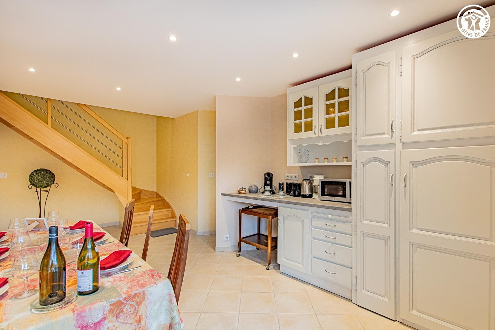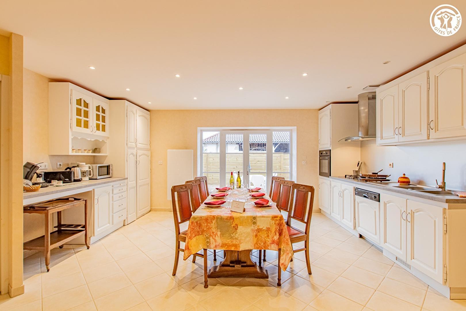 Composition : Maison de village mitoyenne (avec logement propriétaires et résidence secondaire / indépendance totale). Wifi. Chauffage électrique. Rdc : séjour-cuisine, salon TV, Wc indépendant, buanderie. 1er étage : 3 chambres (lit 2 p. 140x190cm / 2 lits 1 p. 90x200cm / lit 2 p. 140x190cm) dont une avec salle d'eau privée (douche/Wc), salle de bain (baignoire + douche), Wc indépendant. Cour-terrasse close + local vélos + parking privés. Supermarché à 900m. Toutes commodités 17 km.