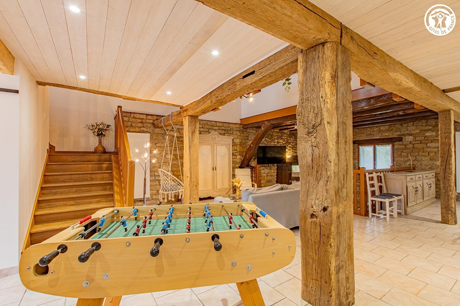 Atypique demeure "seventies" pétrie d'histoire locale & familiale, authentique ancienne - très rare - discothèque de campagne réputée ayant connu son heure de gloire dans les années 80 (édifiée en 1979 puis gérée par le papa de Laure), blottie sur une mini colline en lisière d'une bucolique pâture boisée accueillant "Chaussette" & "Blanquette" les paisibles moutons des propriétaires. En pleine verdoyante campagne bressane, au cœur d'un petit hameau rural résidentiel niché à deux pas des rives de la Seille, remarquable écosystème appréciée des pêcheurs comme des amoureux de la nature protégé en "Zone Natura 2000" comme en ZNIEFF pour ses richesses faunistiques & floristique (réserve d'oiseaux migrateurs, espèces végétales rares, nombreux poissons dont les célèbres silures, animaux & faune sauvage…). Apaisante campagne vallonnée alentour préservée, conjuguant douces prairies parsemées d'étangs & rivières et belles forêts sauvages. Gîte de très bon confort. Exceptionnelle pièce de vie de 100m² lovée à l'endroit de l'ancienne piste de dance & son bar. Chaleureux cachet campagnard aux accents contemporains, inspiré des bâtisses bressanes traditionnelles (aménagement soigné avec d'authentiques poutres, pierres, linteaux en bois, manteaux de cheminée en pierre... de pays). Beaucoup de charme. Ambiance cosy & douillette mixant traditions & modernité. Intimiste terrasse en partie abritée dominant un agréable jardin naturel clos (600m²) & la clairière environnante.