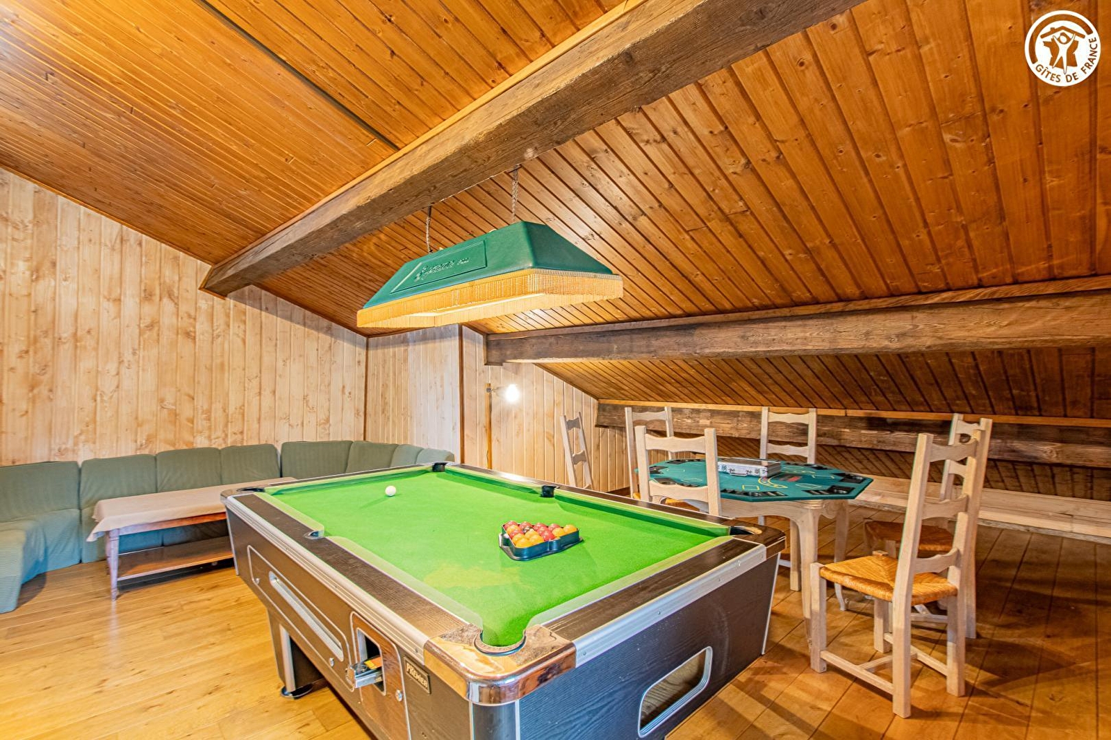 Composition : Maison individuelle. Wifi (fibre). Chauffage PAC. Rdc surélevé (5 marches) : séjour-cuisine-salon (babyfoot), salle d'eau (douche/Wc). 1er étage : 4 chambres (3 avec 2 lits 1 p. 90x190cm / 2 lits 1 p. 90x190cm + 2 lits 1 p. 90x200cm superposés + canapé convertible 2 p. 140x200ccm d'appoint), salon de détente (billard & table poker), sdb (baignoire/Wc). Jardin clos (600m²) + terrasse (abritée en partie) + local vélos + parking privatifs. Petits commerces dont supermarché 7 km. Toutes commodités 11 km.