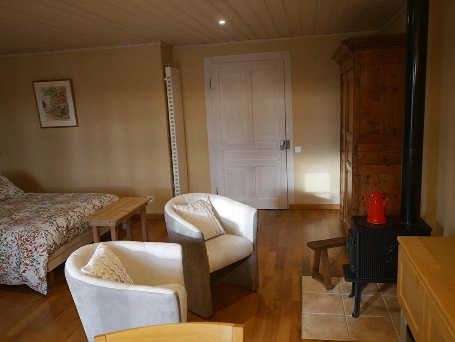 Charmant studio dans une partie d'une ancienne ferme comtoise restaurée. Situé dans un hameau sur le premier plateau du Jura, dans la vallée de l'Angillon et à proximité de la Route des Sapins. Les propriétaires ont souhaité valoriser cette belle ferme comtoise par une "éco-restauration" avec des matériaux sains et écologiques, dans le respect du bâti ancien. Ils auront à cœur de vous accueillir et de vous faire découvrir leur environnement, à deux pas de la région des Lacs, pour un séjour nature, sportif ou reposant. Cet hébergement se compose d'un hall d'entrée, pièce à vivre de type studio avec cuisine ouverte sur coin salon, salle à manger (équipée d'un poêle à bois) et espace couchage avec 1 lit en 140x200. Salle d'eau avec douche, wc indépendants. Terrasse attenante orientée sud-ouest avec salon de jardin. Tarif toutes charges comprises. Draps, linges de toilette, linge de maison fournis. Abri moto et local vélo à disposition. Possibilité de louer un autre gîte pour 2 personnes situé dans la même bâtisse : gîte l'Angillon. Tarif spécial curiste sur demande auprès des propriétaires.