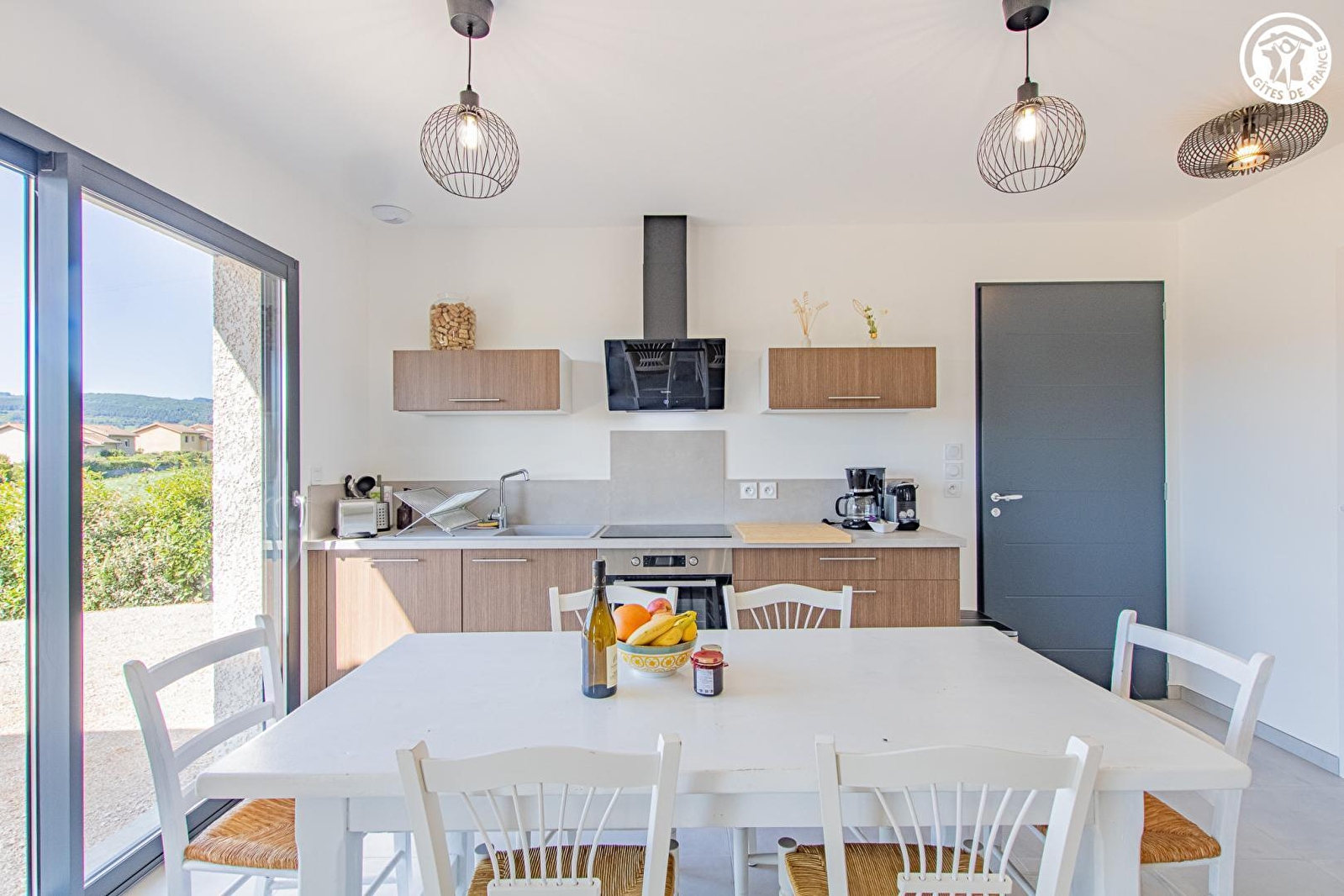 Globe-trotteur avisé, passionné de voyages & d'animaux, Aurélien vous accueille dans une charmante villa contemporaine adossée "en balcon" & "belvédère panoramique", à flanc de coteau sud exposé, au sein d'un lotissement pavillonnaire (bordant une route de campagne en partie passagère la semaine, suivant les horaires de déplacements pendulaires) niché sur les hauteurs du ravissant bourg viticole, typique & commerçant, de la Roche Vineuse, l'une des rares communes de Saône-et-Loire ayant conservé son nom révolutionnaire, dotée d'appréciables nombreux petits commerces comme d'un patrimoine notable (élégantes demeures "Renaissance" du XVIIIe aux toits de lave, lavoirs & cadoles, chapelle romane du XIe, site archéologique des "Carrières de la Lie" inscrit aux Monuments Historiques…). Agréable cadre alentour, lové en pleine campagne mâconnaise préservée (protégée en ZNIEFF pour ses richesses faunistiques & floristiques), au cœur même des bucoliques vignobles du réputé "Val Lamartinien" (en cépage Chardonnay, du nom du célèbre poète, écrivain & homme politique français, natif des lieux), sous les crêtes boisées de la montagne de la Rochette abritant sur 7 ha un rare "Espace Naturel Sensible" ("Lande de Nancelle"), accolée à un vaste massif forestier sauvage & sauvegardé (à parcourir à pied ou VTT). Gîte de très bon confort. Spacieux & lumineux. Élégant cachet contemporain. Ambiance zen & douillette dans une douce sobriété. Agréable terrasse abritée. Jardin clos pentu offrant une belle vue dégagée sur la campagne environnante.