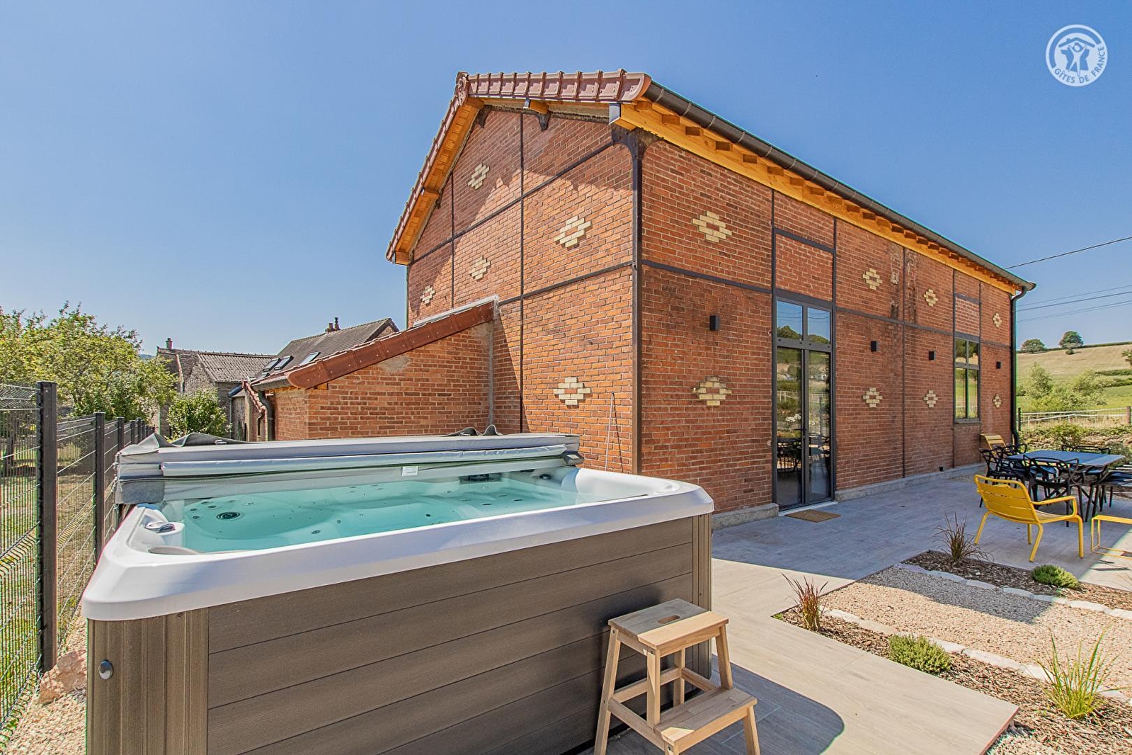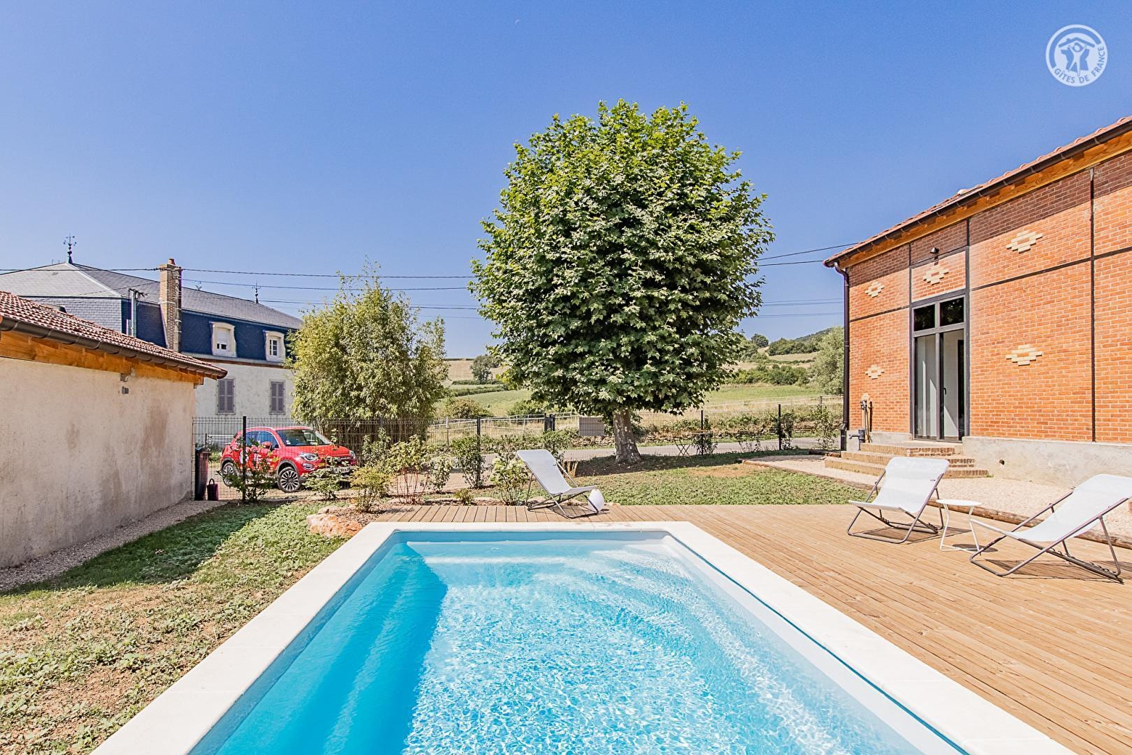 Authentique ancienne "école de filles du village" datant de la fin du XIXe - bâti de caractère chargé d'histoire doté d'une insolite élégante architecture en briques - intégralement restaurée dans les règles de l'art et soigneusement revisitée avec goût en confortable villégiature de charme, niché au calme en lisière de prairies face aux vignobles (sis à 200m) au sein d'un paisible pittoresque village viticole de la Côte Chalonnaise. Doté d'une église romane classée du XIe, lové autour d'une dépaysante place de village de carte postale & traversé par une bucolique petite rivière poissonneuse, ce bourg vivant & commerçant profite d'un magnifique cadre paysagé vallonné de coteaux de vignobles & douces prairies, blotti au pied des collines boisées de vastes massifs forestiers (nombreuses balades en pleine nature & exceptionnels belvédères panoramiques) au creux de la sublime "Vallée des Vaux". Spacieux gîte de grand confort. Pièce de vie de 60m². Equipement complet de grande qualité. Chaleureux cachet contemporain raffiné & cossu. Ambiance douillette & ultra cosy. Énormément de charme. Agréable terrain clos de 800m² parfaitement aménagé, comprenant : jardinet, vaste double terrasse (est & ouest / très beaux couchers de soleil), piscine chauffée (5x3m avec douche), spa (6 places), terrain de pétanque & table de ping-pong. Belle vue sur les vignobles environnants.