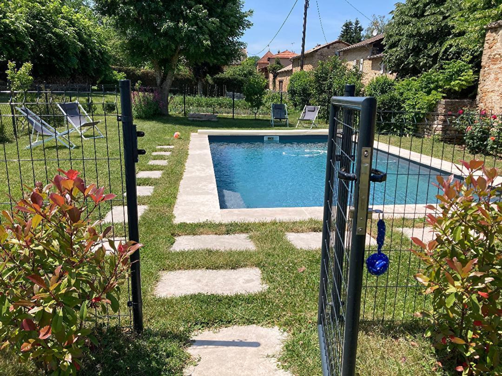 Authentique écurie du 18ème siècle chargée d'histoire (dépendance agricole liée au château voisin) soigneusement restaurée avec style dans un esprit résolument contemporain, sise sur une vaste propriété soignée de 2800m² - accessible par un porche historique - blottie au pied d'un majestueux château médiéval du XIIIème (jadis lié aux moines de Cluny), dominant sur un promontoire ce paisible petit village viticole typique (église romane classée du XIème, tour de Perceval XVIème, antique pont du XVIIème, moulins à eau, habitations bourguignonnes traditionnelles à découvrir). Lové au calme en pleine campagne, au creux d'un ravissant vallon préservé, en plein cœur du vignoble du Mâconnais (plusieurs AOC dont le célèbre Chardonnay de Viré-Clissé) et lisière de vastes forêts (parsemées de nombreux chemins de randonnées en pleine nature), le site dispose d'un cadre paysager vallonné de toute beauté entre magnifiques coteaux de vignobles, prairies, rivières poissonneuses et collines boisées offrant un exceptionnel belvédère panoramique (jusqu'au Mont-Blanc par temps clair !). Gîte de très bon confort (à l'architecture « compacte » très moderniste). Chaleureux & élégant cachet campagnard contemporain. Ambiance zen & douce. Beaucoup de charme. Cosy & cocooning. Spacieuses doubles terrasses exposées & ombragées ouvertes sur un agréable jardin végétalisé & arboré comprenant une belle piscine (4x8m) & une cour (terrain de pétanque naturel !).