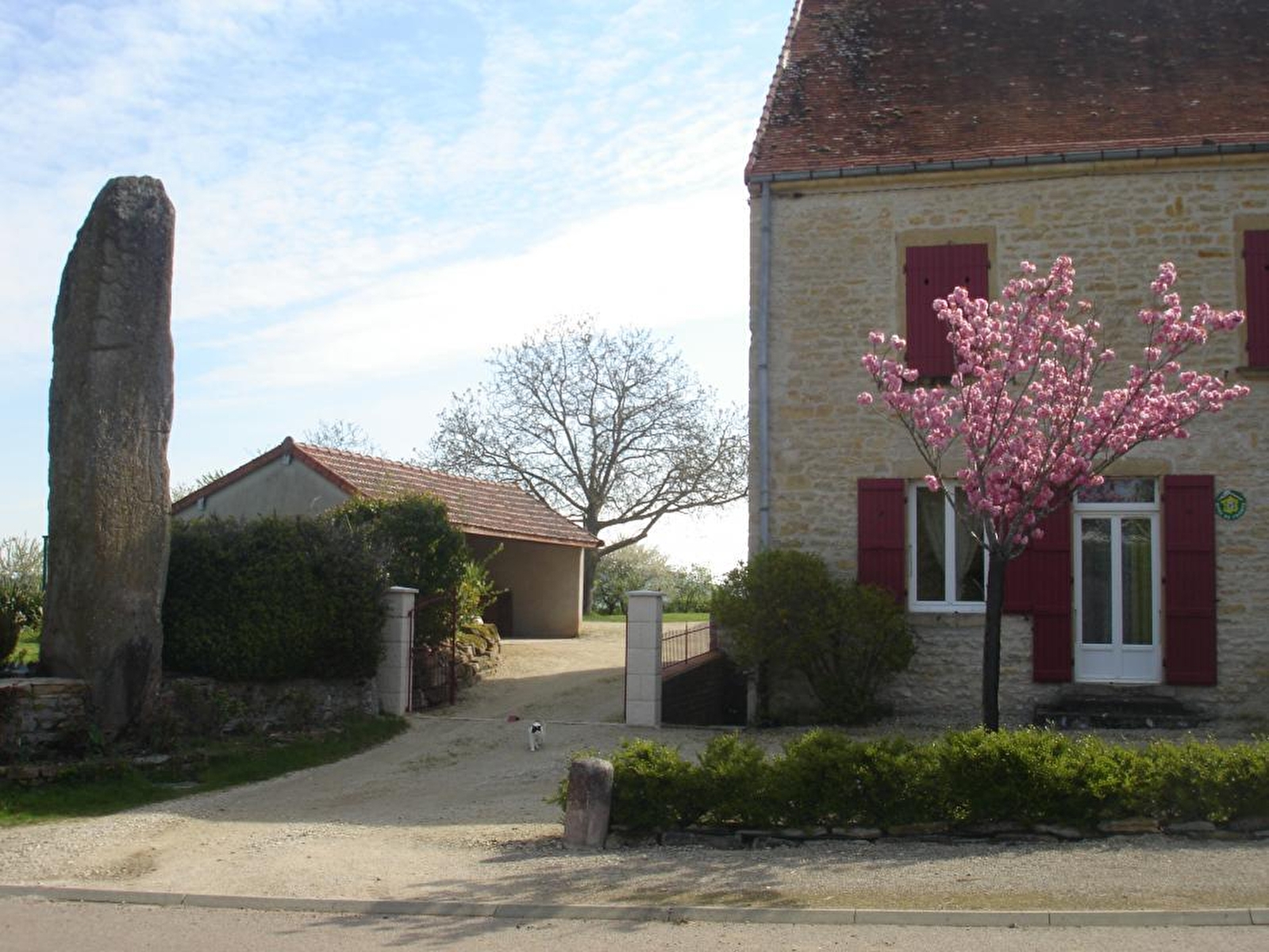 Martine & Rémy vous ouvrent les portes d'une charmante demeure traditionnelle de caractère datant de 1885 soigneusement réhabilitée & chargée d'histoire (ancienne auberge-relais du village), blottie sur une insolite propriété où trône (à l'entrée côté rue) "La Pierre aux Fées", un authentique menhir celtique "gravé" classé "Monument Historique" ("pierre levée" de 15 tonnes & 6 mètres, la plus haute de ce type en Saône-et-Loire) exceptionnelle vestige néolithique & véritable perle patrimoniale de Bourgogne. Au cœur d'un paisible petit village résidentiel & agricole juché "en belvédère" sur une colline dominant la douce campagne creusotine vallonnée, aux confins du sud Châlonnais, apaisant écrin champêtre & naturel préservé parsemé de lacs, étangs & rivières (en partie protégé en "Zone Natura 2000" & "ZNIEFF" pour ses richesses faunistiques & floristiques) conjuguant bucoliques bocages & vastes forêts sauvages, en toute proximité des premiers vignobles (Côtes Chalonnaises) comme des anciens bassins miniers reconvertis vers les activités ludiques de pleine nature & culturelles (exceptionnel patrimoine manufacturier des XIXe et XXe à découvrir). Gîte de bon confort. Beaux volumes. Chaleureux cachet campagnard aux accents contemporains mixé à l'âme dépaysante d'une ancienne bâtisse (conservation du manteau de cheminée en pierres "daté" & des poutres d'origine). Large terrasse nichée "à l'ombre" du menhir ouverte sur un agréable jardin offrant une belle vue dégagée sur la campagne environnante.