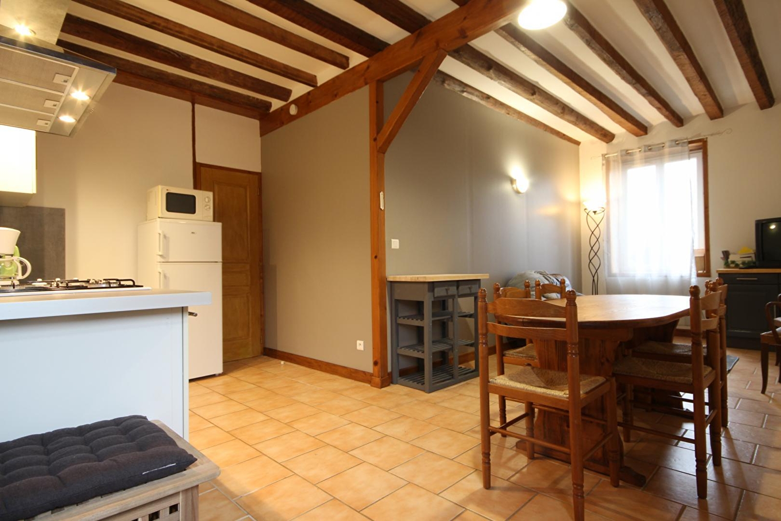 Composition : Gîte dans maison comprenant 1 autre logement saisonnier (sur propriété abritant le second gîte des propriétaires). Wifi (fibre). Chauffage électrique. Rdc : séjour-cuisine-salon, 1 chambre (lit 2 p. 140x190cm + 2 lits 1 p. 90x190cm superposés), salle d‘eau (douche), Wc indépendant. Jardin (100m²) + terrasse + parking privés. Local vélos. Commerces & services 11 km. Supermarchés 10 km. A noter : la ligne TGV passe à proximité du village (sans nuisance particulière).
