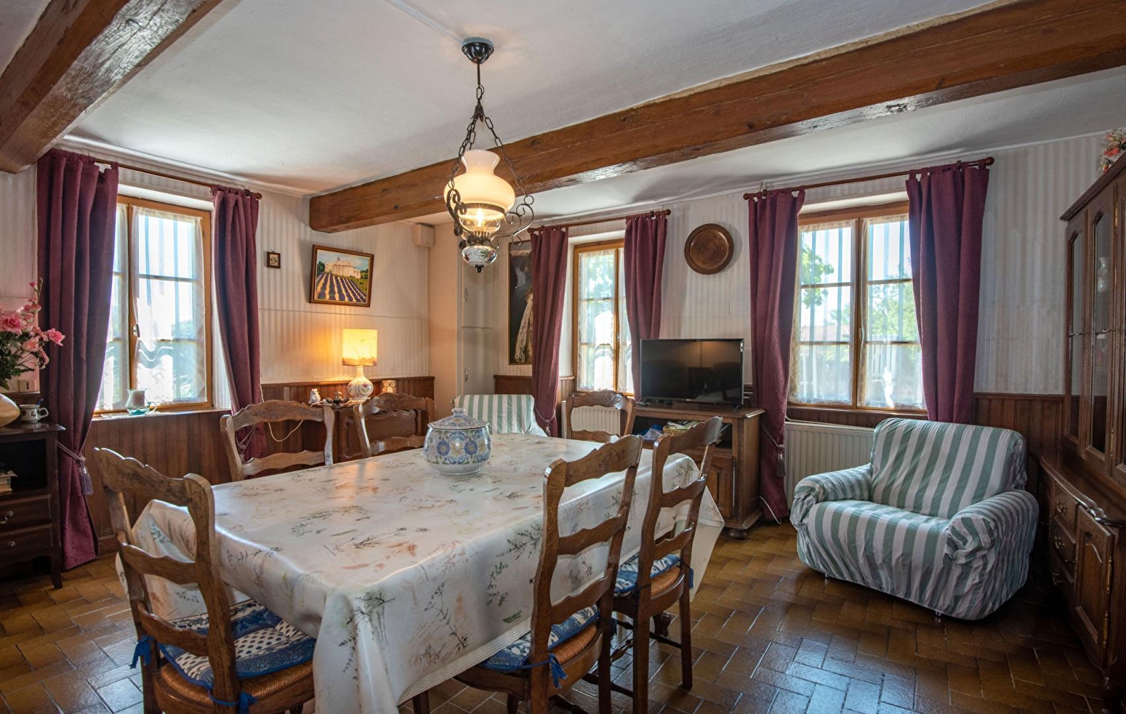 Composition : Maison individuelle. Chauffage gaz. Rdc : cuisine-séjour, salon, salle d’eau (douche/WC), buanderie (ouverte sur cage escalier). 1er étage : 2 chambres (lit 2 p. 140x190cm / 2 lits 1 p. 120x190cm). Parking privé + garage (1 place). Véranda + cour + jardin/verger (300m2 environ). Commerces & services 7 km. Gares TGV : Mâcon-Loché 64 km, Le Creusot 78 km.