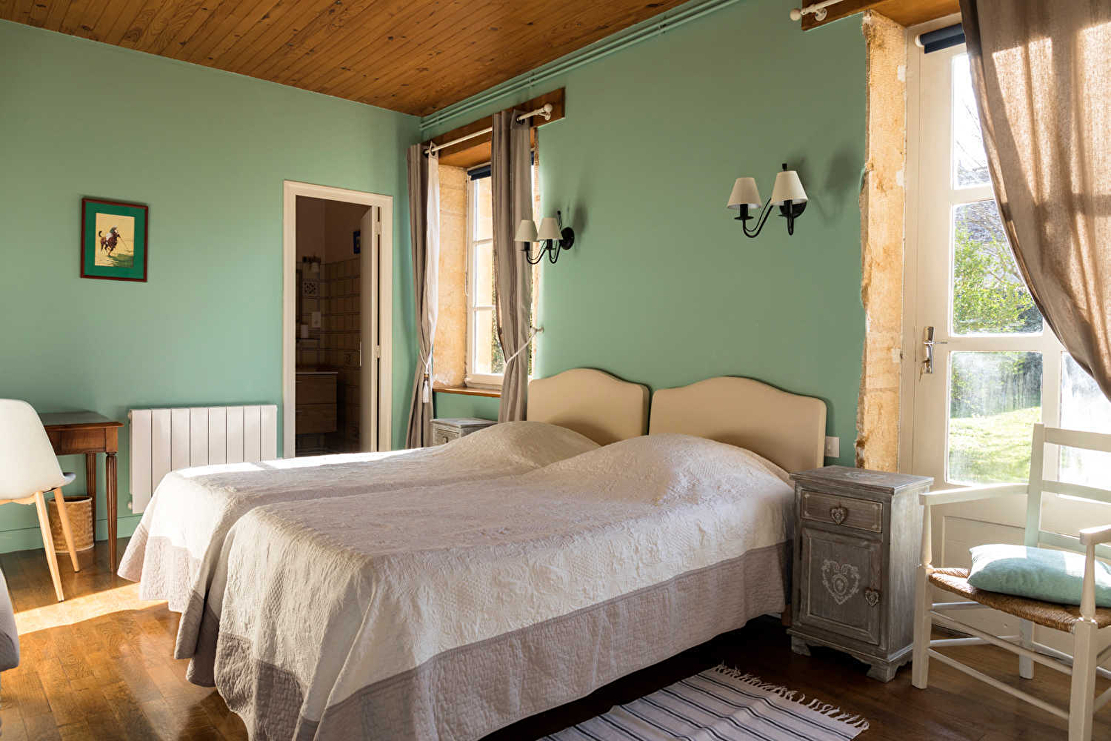 Composition : Maison individuelle voisinant maison des propriétaires (totale indépendance). Wifi. Chauffage électrique + poêle à bois. Gîte de plain-pied (rdc) : cuisine, séjour-salon (canapé convertible 2 p. 140x190cm en appoint), 2 chambres (lit 2 p. 160x200cm / 2 lits 1 p. 90x190cm) avec salles de bain privatives (baignoire/Wc), Wc indépendant. Cour close + terrasse sur cour (en gravier) + local vélos + parking privés. Baby-foot et table ping-pong dans grange jouxtant le gîte. Commerces & supermarchés 6.5 km.