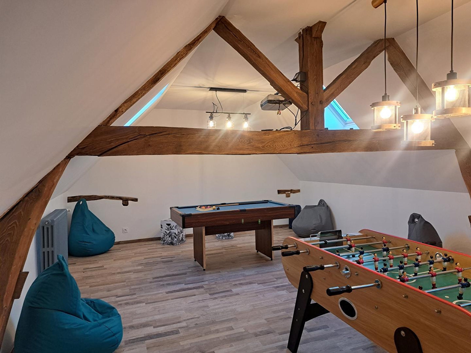 Composition : Maison individuelle sur 3 niveaux. Chauffage central fioul + poêle à bois. Wifi. Rdc : séjour-cuisine-salon, 1 chambre (2 lits 1 p. 90x190cm), salle d'eau (douche), Wc indépendant. 1er étage : 3 chambres (lit 2 p. 140x190cm / lit 2 p. 140x190cm / lit 2 p. 140x190cm), salle d'eau (douche/Wc), salle de jeux (baby-foot + billard + karaoké). 2ème étage : 2 chambres (lit 2 p. 140x190cm + lit 1 p. 90x190cm / lit 2 p. 140x190cm), Wc indépendant. Jardin clos pentu (3000m²) + terrasse (gravier) + balconnet + cour + local vélos (vélos dispos) + parking privés. Commerces & services 6 km. Supermarché 4 km.