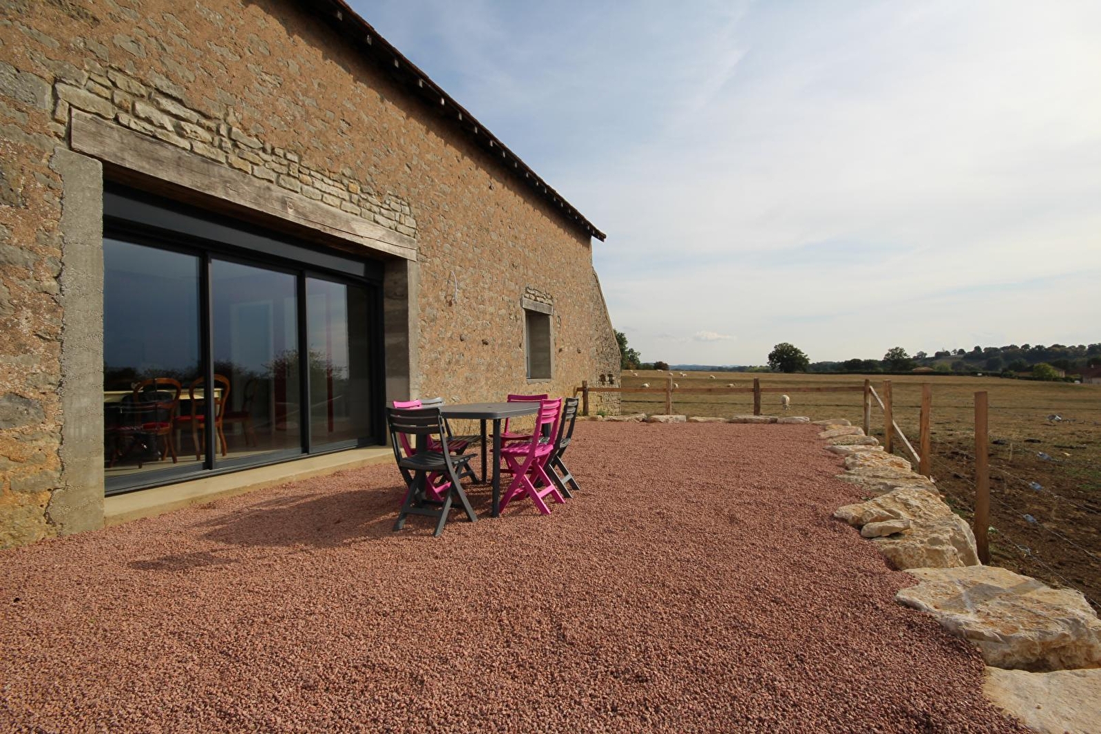 Élégante ferme traditionnelle de caractère du 19ème siècle, soigneusement restaurée avec goût, lovée en pleine campagne en lisière de prairies (où pâturent de paisibles charolaises l'été). Au sein d'un hameau très calme bordant le centre d'un petit village typique, d'origine celtique, doté d'un riche patrimoine à découvrir (fours à chaux classés aux MH, uniques en France, église romane du 12ème, château du 16ème…). Splendide cadre champêtre & rural préservé. Gîte ultra spacieux de très bon confort. Large pièce de vie lumineuse et volumineuse. Chaleureux cachet « campagnard » conjuguant rénovation patrimoniale soignée et esprit résolument contemporain. Ambiance douce et zen. Vaste terrasse panoramique exposée, ouverte sur la prairie environnante, complétée par une petite terrasse abritée, plus intimiste. Charmant jardin aménagé cerclé d'anciens murs en pierres sèches chargés d'histoire, doté d'un agréable espace détente ombragé sous des arbres. Belle vue dégagée sur la campagne environnante.