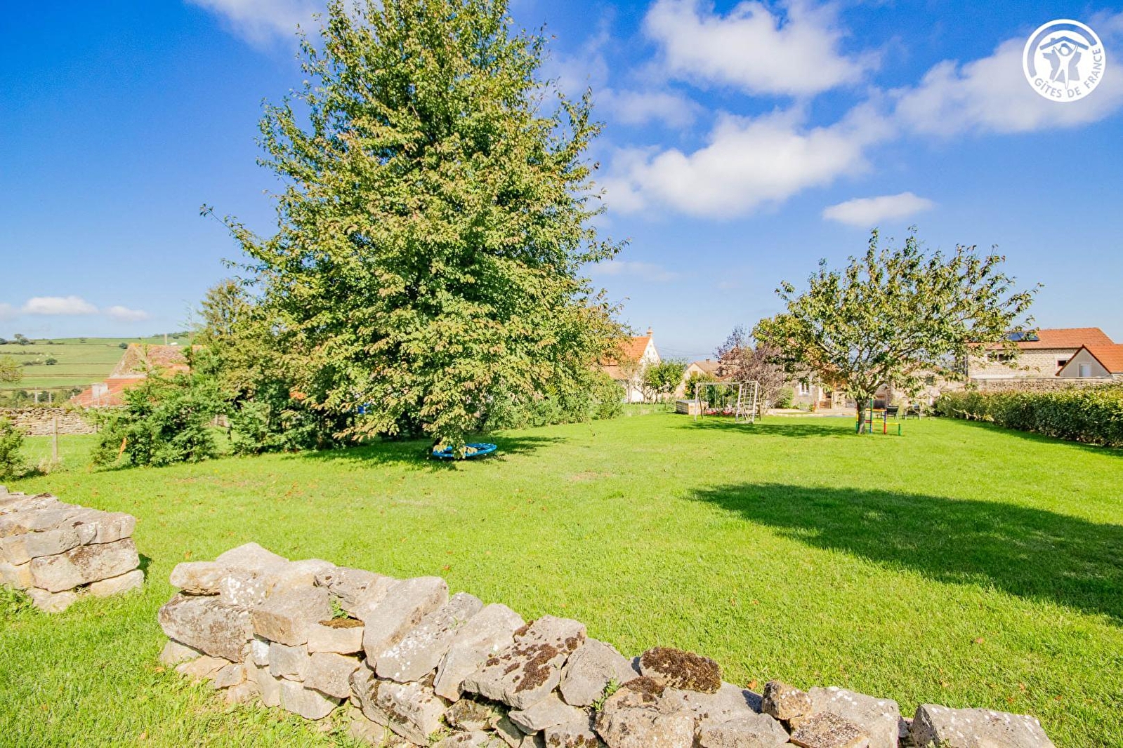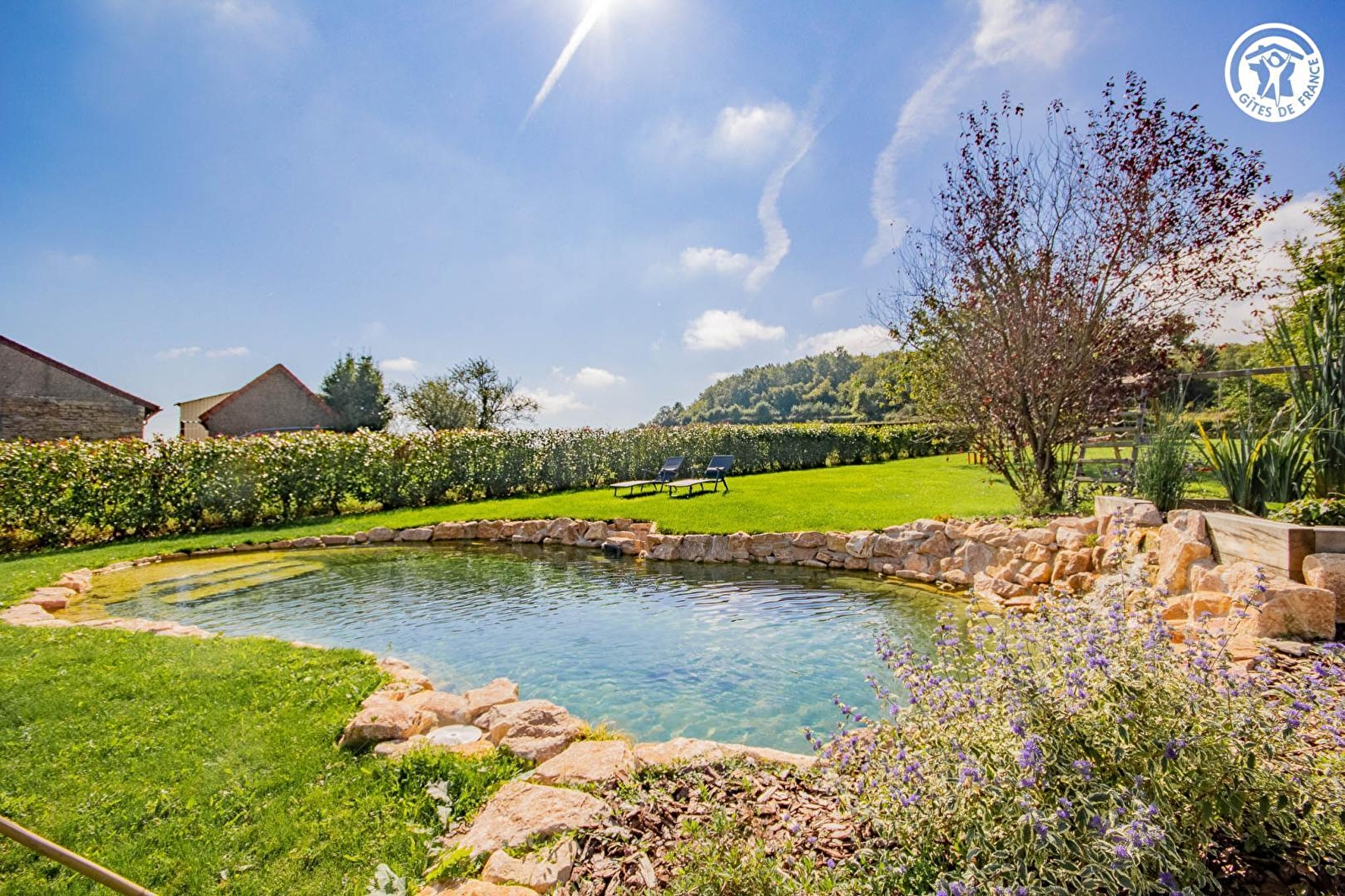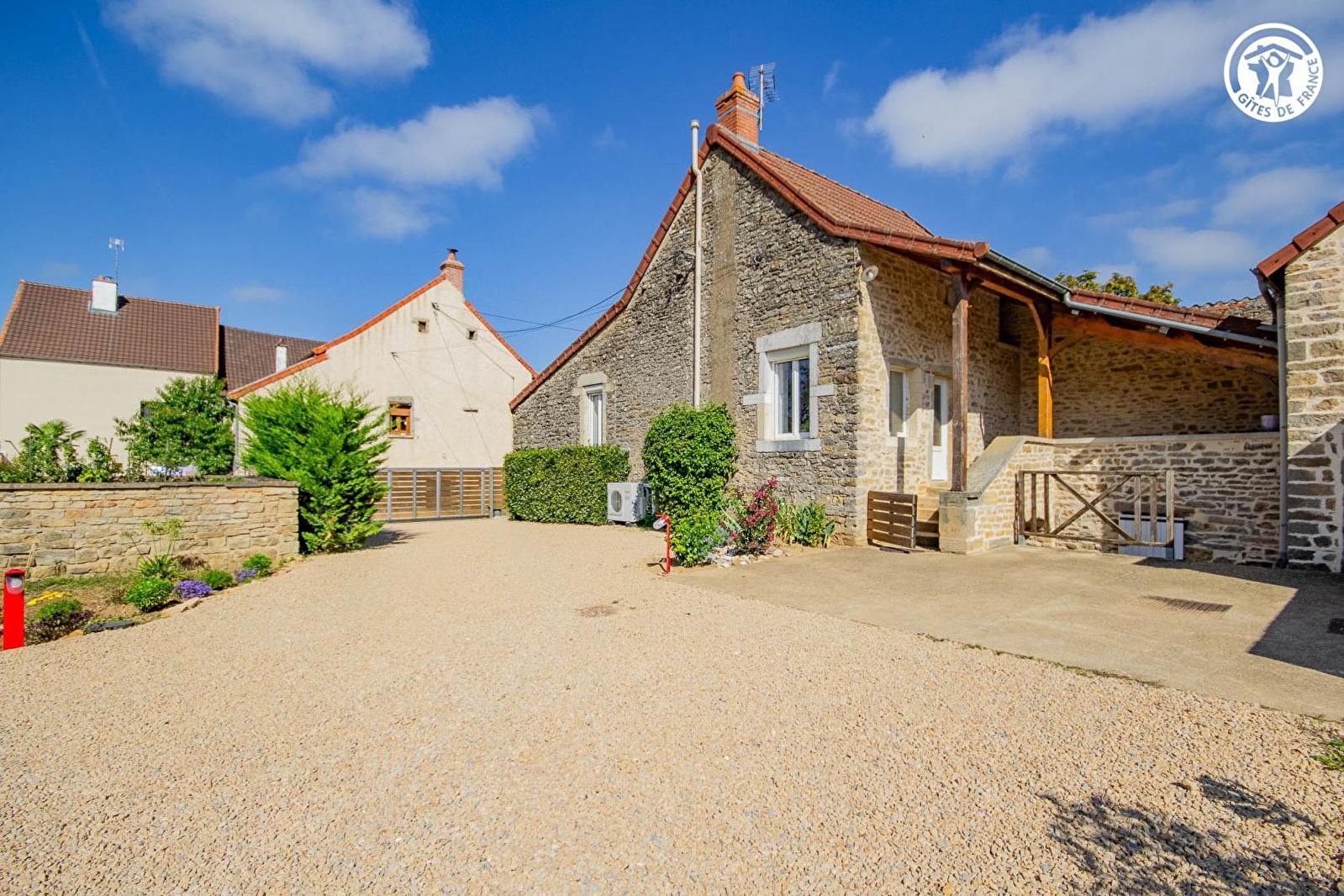 Margareth & Mickaël vous accueillent au sein d'une authentique demeure vigneronne du XIXe siècle soigneusement restaurée (ancien domaine viticole & agricole) nichée au calme en "mini impasse" & lisière de prairies boisées, à deux pas des vignes, au cœur d'un pittoresque petit hameau adossé "en balcon" à flanc de colline, belvédère de choix offrant une magnifique vue dégagée sur les environs jusqu'au Mont-Blanc par temps clair ! Totale tranquillité en pleine campagne, blotti au creux d'un sublime écrin paysagé vallonné, succession de coteaux de vignobles, forêts, rivières & prairies. Paysages & panoramas absolument enchanteurs. Village viticole typique & sauvegardé des Côtes chalonnaises - l'un des plus anciens avec sa cave coopérative produisant plusieurs AOC - Bissey-sous-Cruchaud dispose d'une aire de loisirs (city-stade, toboggan, jeux d'enfants divers, mini stade de foot) & profite d'un superbe environnement champêtre & naturel préservé. Gîte de très bon confort. Chaleureux cachet campagnard d'esprit contemporain, mixant traditions & modernité, sublimé par l'âme dépaysante des lieux (manteau de cheminée en pierres, poutres & plafond, charpente… d'origine). Beaucoup de charme. Ambiance douillette. Balcon-terrasse abrité (de plain-pied avec le gîte) dominant un agréable jardin clos de 1000m² (avec portail électrique) soigneusement paysagé (végétalisé, arboré & fleuri), disposant d'une balançoire & d'une très rare insolite "piscine biologique" en baignade naturelle de 8x4m.