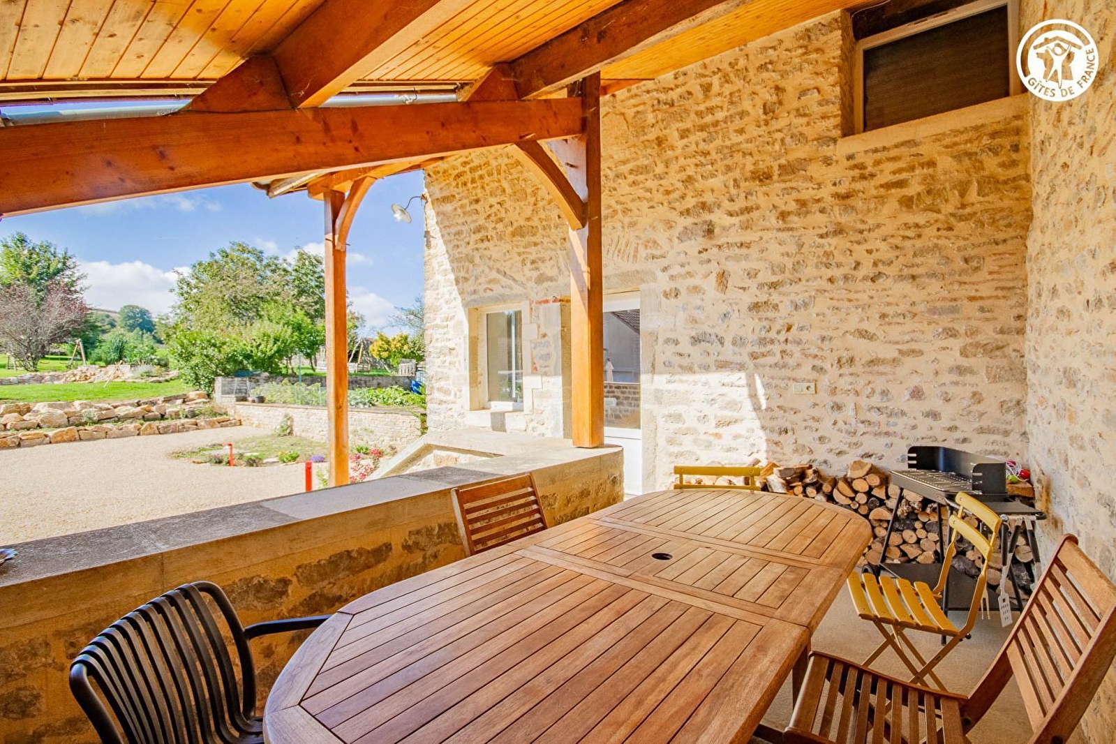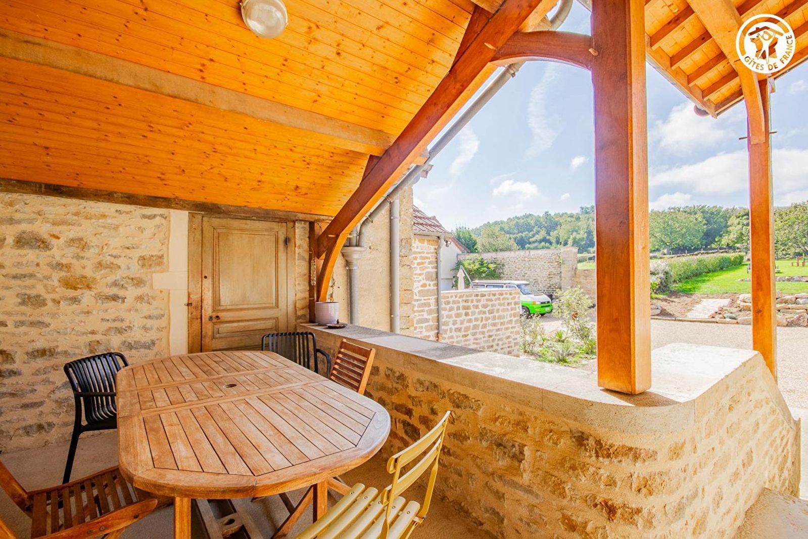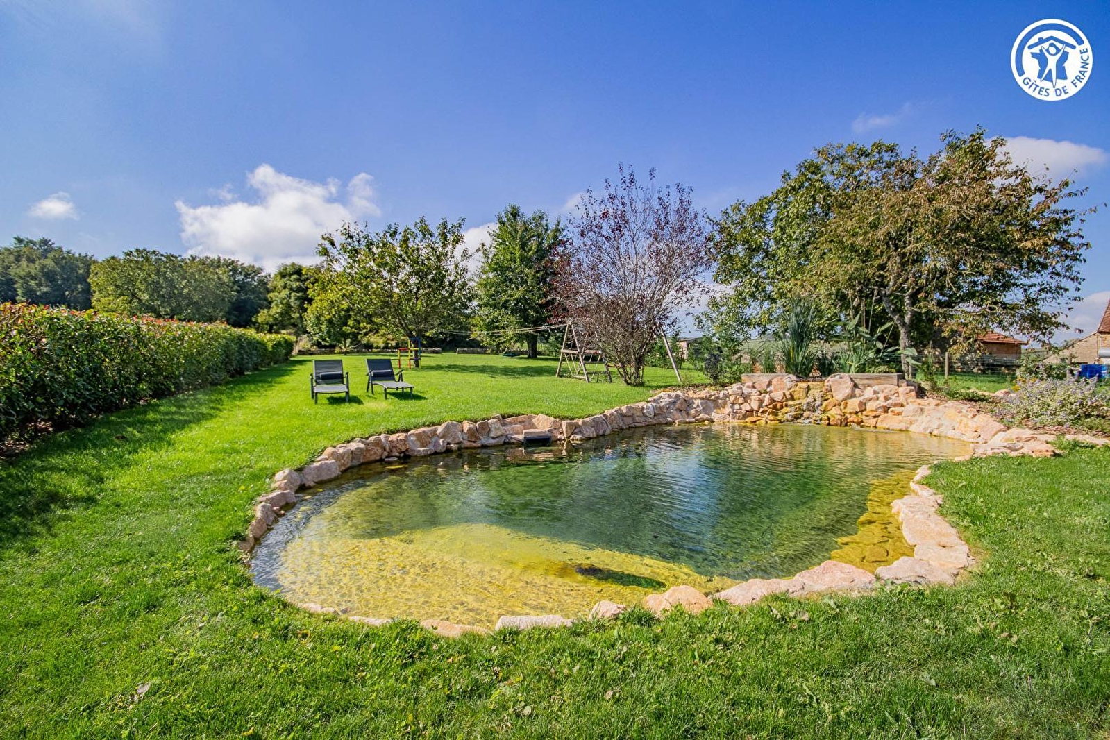 Margareth & Mickaël vous accueillent au sein d'une authentique demeure vigneronne du XIXe siècle soigneusement restaurée (ancien domaine viticole & agricole) nichée au calme en "mini impasse" & lisière de prairies boisées, à deux pas des vignes, au cœur d'un pittoresque petit hameau adossé "en balcon" à flanc de colline, belvédère de choix offrant une magnifique vue dégagée sur les environs jusqu'au Mont-Blanc par temps clair ! Totale tranquillité en pleine campagne, blotti au creux d'un sublime écrin paysagé vallonné, succession de coteaux de vignobles, forêts, rivières & prairies. Paysages & panoramas absolument enchanteurs. Village viticole typique & sauvegardé des Côtes chalonnaises - l'un des plus anciens avec sa cave coopérative produisant plusieurs AOC - Bissey-sous-Cruchaud dispose d'une aire de loisirs (city-stade, toboggan, jeux d'enfants divers, mini stade de foot) & profite d'un superbe environnement champêtre & naturel préservé. Gîte de très bon confort. Chaleureux cachet campagnard d'esprit contemporain, mixant traditions & modernité, sublimé par l'âme dépaysante des lieux (manteau de cheminée en pierres, poutres & plafond, charpente… d'origine). Beaucoup de charme. Ambiance douillette. Balcon-terrasse abrité (de plain-pied avec le gîte) dominant un agréable jardin clos de 1000m² (avec portail électrique) soigneusement paysagé (végétalisé, arboré & fleuri), disposant d'une balançoire & d'une très rare insolite "piscine biologique" en baignade naturelle de 8x4m.