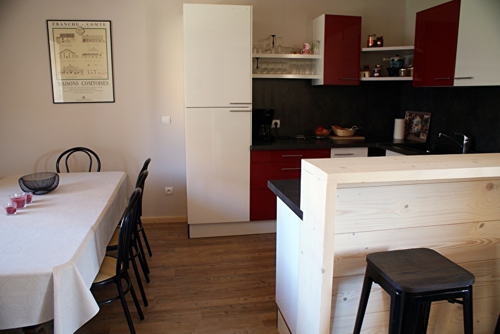 Logement rénové à l'étage d'une maison. Hall d'entrée, cuisine ouverte sur espace repas et coin salon (poêle à bois), salle d'eau avec WC. Les chambres se situent à l'opposé pour un meilleur confort : chambre 1 et chambre 2 avec chacune 1 lit 2 places. Le gite dispose d'une terrasse de 19m² avec un salon de jardin, barbecue grill plancha et parasol. Box internet par fibre. Possibilité de location de draps 1 personne et 2 personnes avec taie oreiller, linges de toilette et draps de bain. Prise renforcée GreenUp voiture électrique.