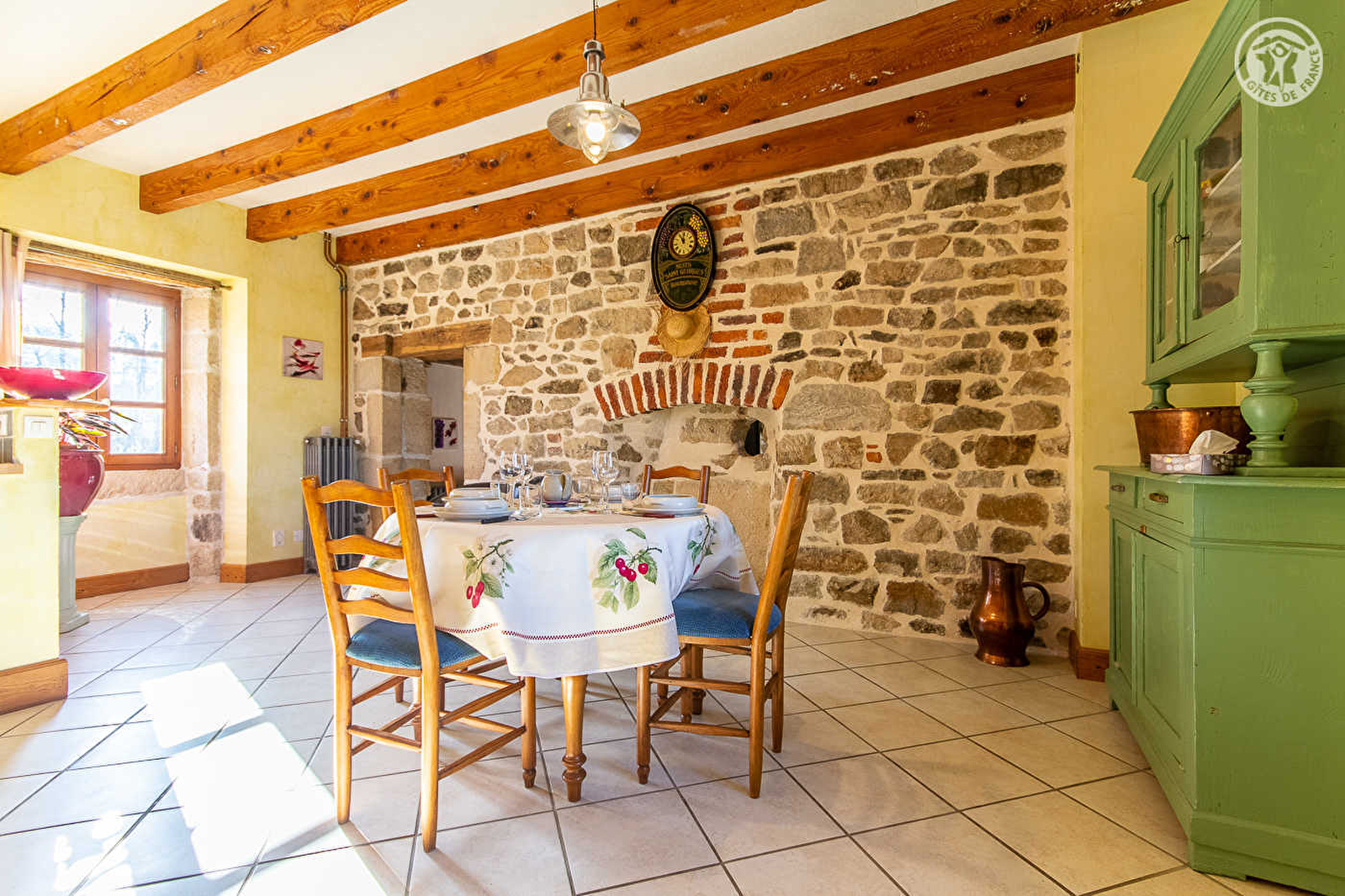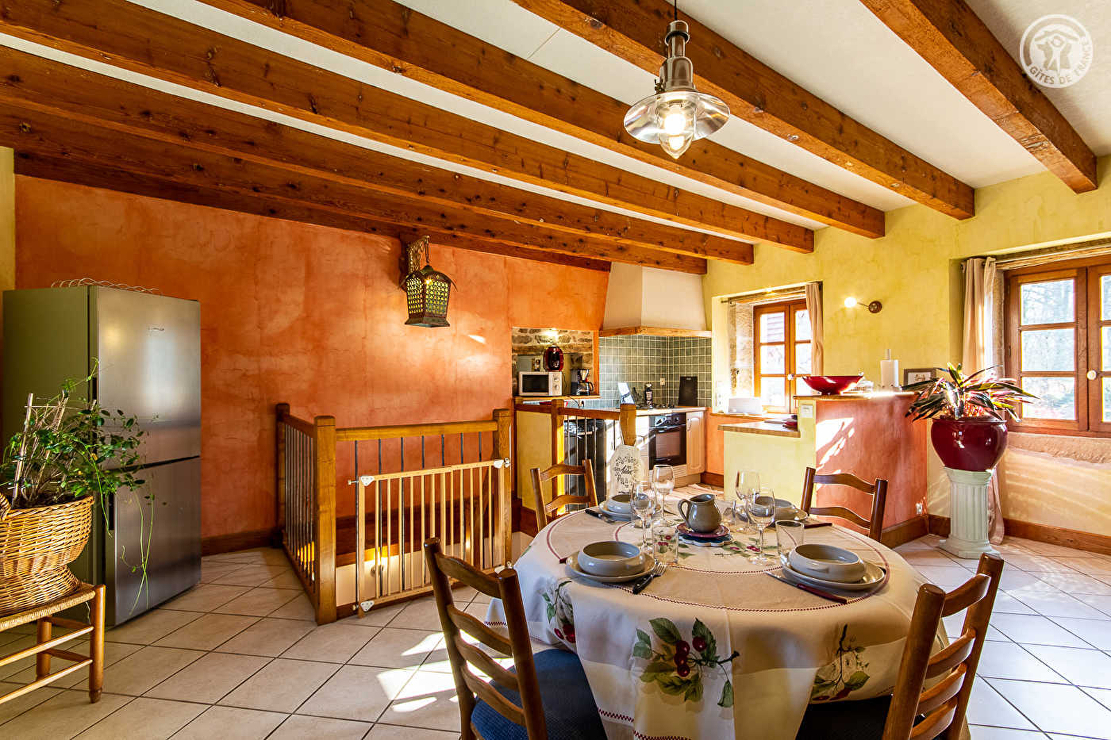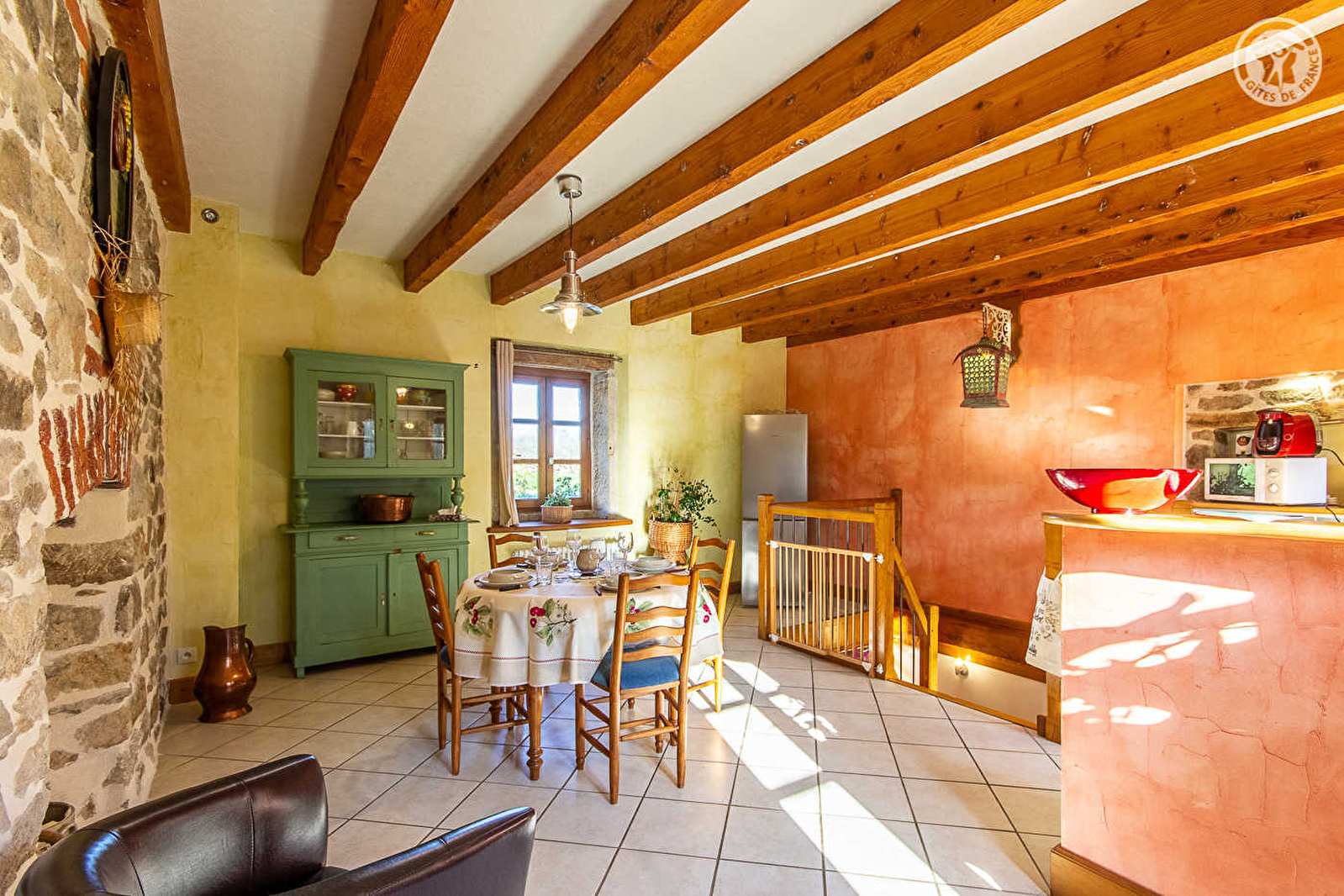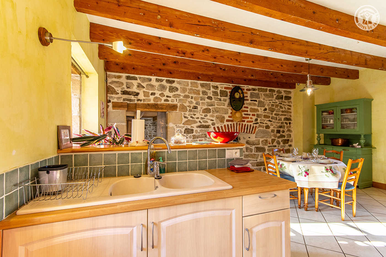 Authentique corps de ferme traditionnel de 1800 chargé d'histoire - élégante bâtisse de caractère intégralement restaurée dans les règles de l'art - lové au sein d'un petit hameau rural à 6 km du charmant bourg typique de Saint-Sernin-du-Bois (nombreuses commodités sur place). Ravissant parc soigné de 5300m² (commun à la propriété), aménagé & fleuri, bordé par d'anciens murs historiques en pierres sèches, véritable aire de jeux naturelle pour petits & grands (avec terrain de pétanque sur cour !). Calme absolu en pleine campagne autunoise au creux d'un magnifique écrin préservé de nature & verdure, avec comme voisins proches les paisibles chevaux, ânes et brebis parqués sur la pâture jouxtant le jardin & la diverse faune sauvage observable sur place. Splendide cadre & site paysager en lisière de bocage, forêt & prairies proche de bucoliques étangs poissonneux. Petit coin de paradis vert enchanteur, idéal pour les enfants. Belle vue sur la campagne environnante. Gîte de très bon confort. Ultra spacieux. Grande pièce de vie. Chaleureux cachet campagnard allié à une belle restauration patrimoniale (murs en pierres, magistrale tête de cheminée, poutres, plafond en chêne, linteaux en briques & bois d'origine). Ambiance douce & dépaysante d'une ancienne demeure. Beaucoup de charme et caractère. Cocooning & cosy. Large agréable terrasse privative, exposée et ombragée.