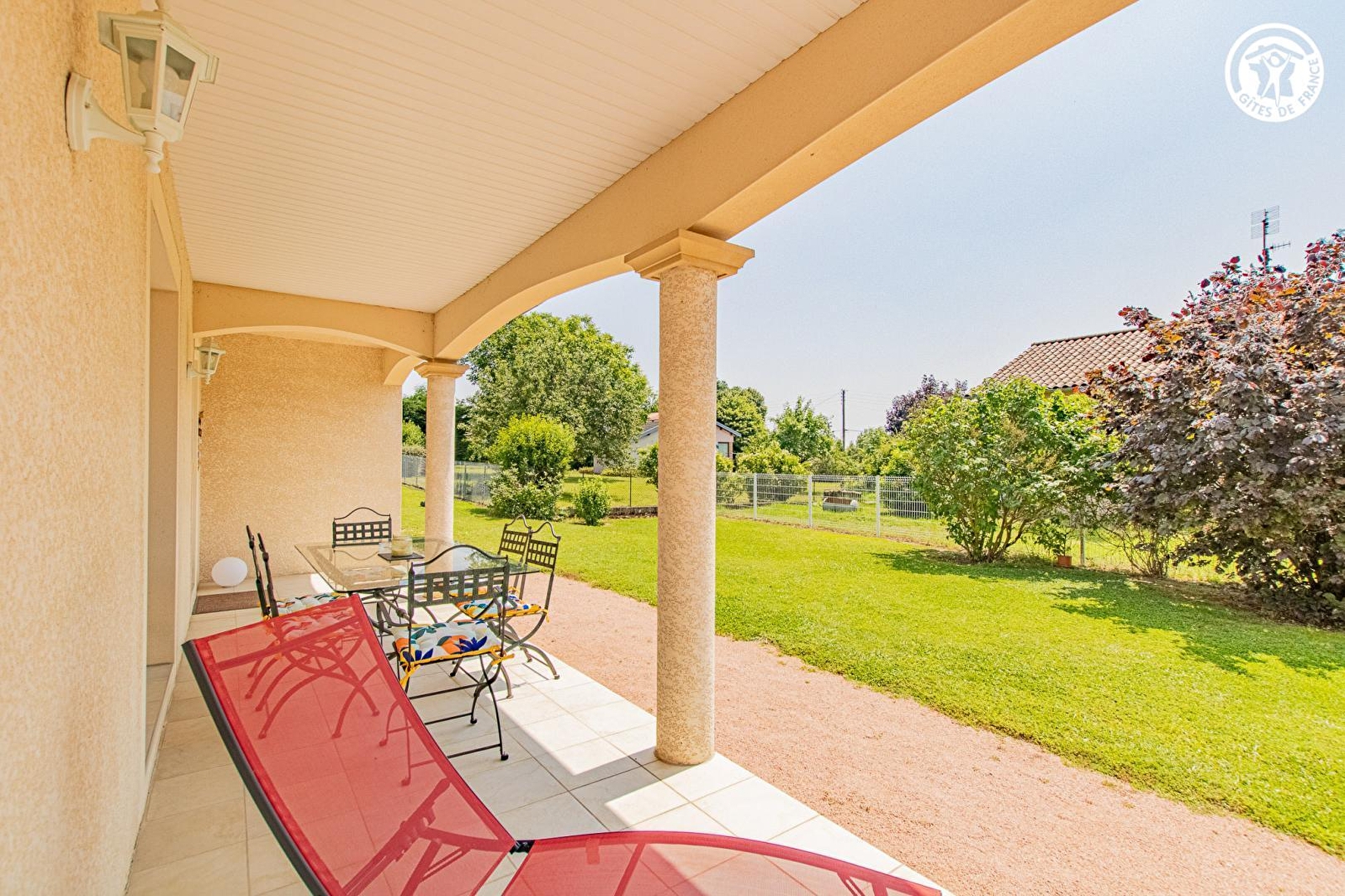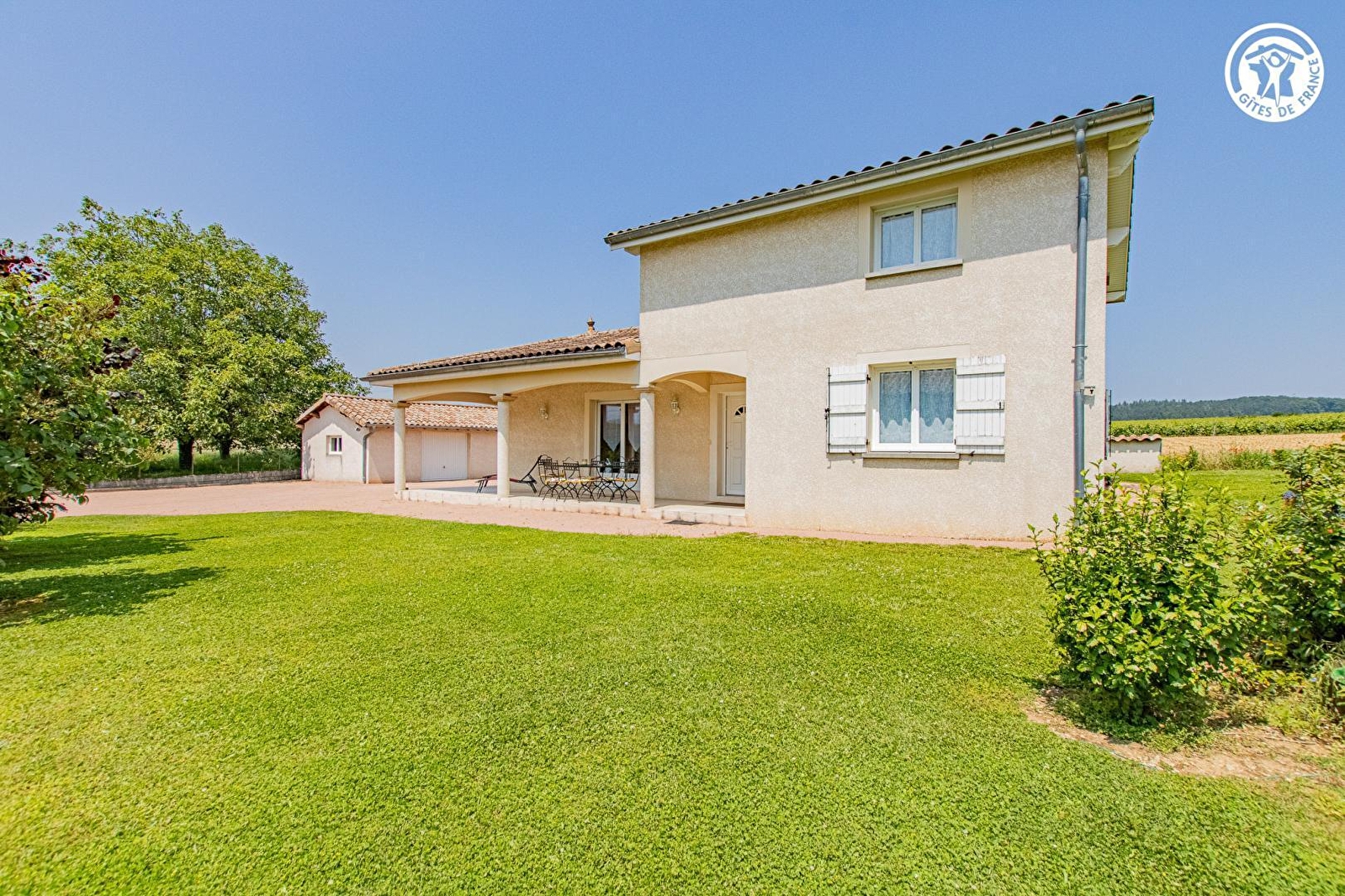 Brigitte & Pierre-Yves vous accueillent au sein d'une belle maison contemporaine de style (2008), sise au calme en lisière immédiate des vignes du célèbre "Val Lamartinien" qui "lèchent" littéralement la propriété, au cœur d'un paisible petit hameau viticole & rural. Totale tranquillité en pleine campagne mâconnaise, tout à la fois viticole & naturelle, proche de l'intégralité des commodités comme des axes majeurs de circulation, lové au creux d'un plateau de vignobles juché à flanc de coteau sud bien exposé, sous les crêtes boisées d'un vaste massif forestier sauvage abritant plusieurs espaces naturels protégés & classés en ZNIEFF pour leurs remarquables écosystèmes faunistiques & floristiques (dont la rare & atypique "Lande de Nancelle" accessible à 3.5 km). Magnifique écrin champêtre de collines & douces montagnes vallonnées, conjuguant coteaux de vignobles, prairies bocagères & belles forêts. Splendide cadre paysagé alentours, 100% reposant. Gîte de très bon confort. Ultra spacieux. Grande pièce de vie. Chaleureux cachet "campagnard contemporain", sobre & douillet. Vaste terrasse abritée (large coursive couverte) ou terrasse en gravier "sur cour" exposée & ombragée (au choix). Agréable jardin engazonné & arboré de 800m², parfaite aire de jeux pour les enfants, doté d'un mini verger (pommier & prunier / cueillette possible). Grande cour, soigneusement aménagée, potentiel "terrain de pétanque " naturel pour les amateurs. Belle vue dégagée sur les vignobles & la campagne environnante dont la célèbre Roche de Solutré en toile de fond.