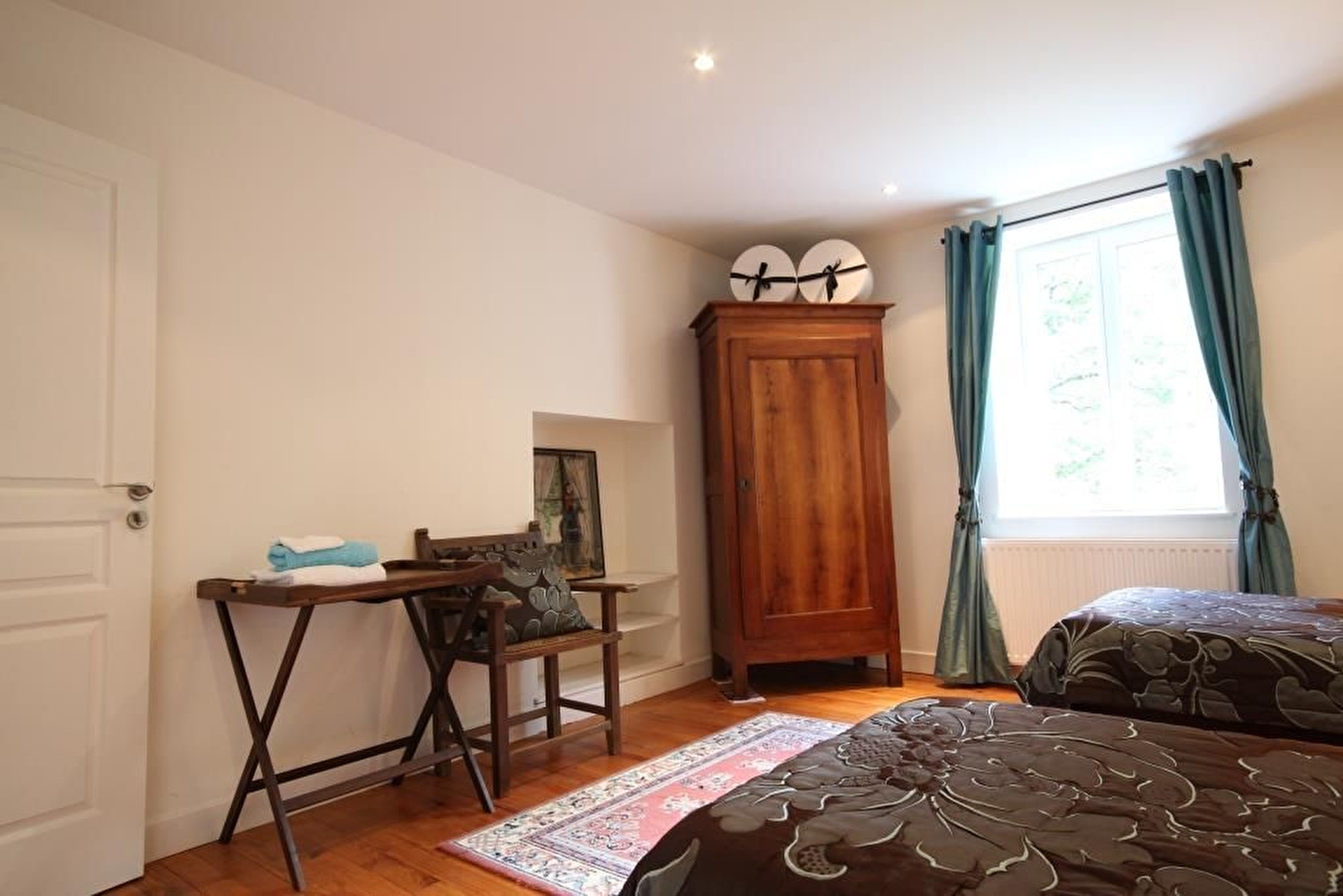 Maison de caractère, indépendante sur grand terrain clos, vallonné et arboré de 3 hectares au bord des bois. Au rez-de-chaussée: grand salon, salle à manger, cuisine équipée, 1 wc, 1 chambre (2 lits 90 cm) avec salle de bain avec wc (accessible handicapés). Etage 1 : 4 chambres (2