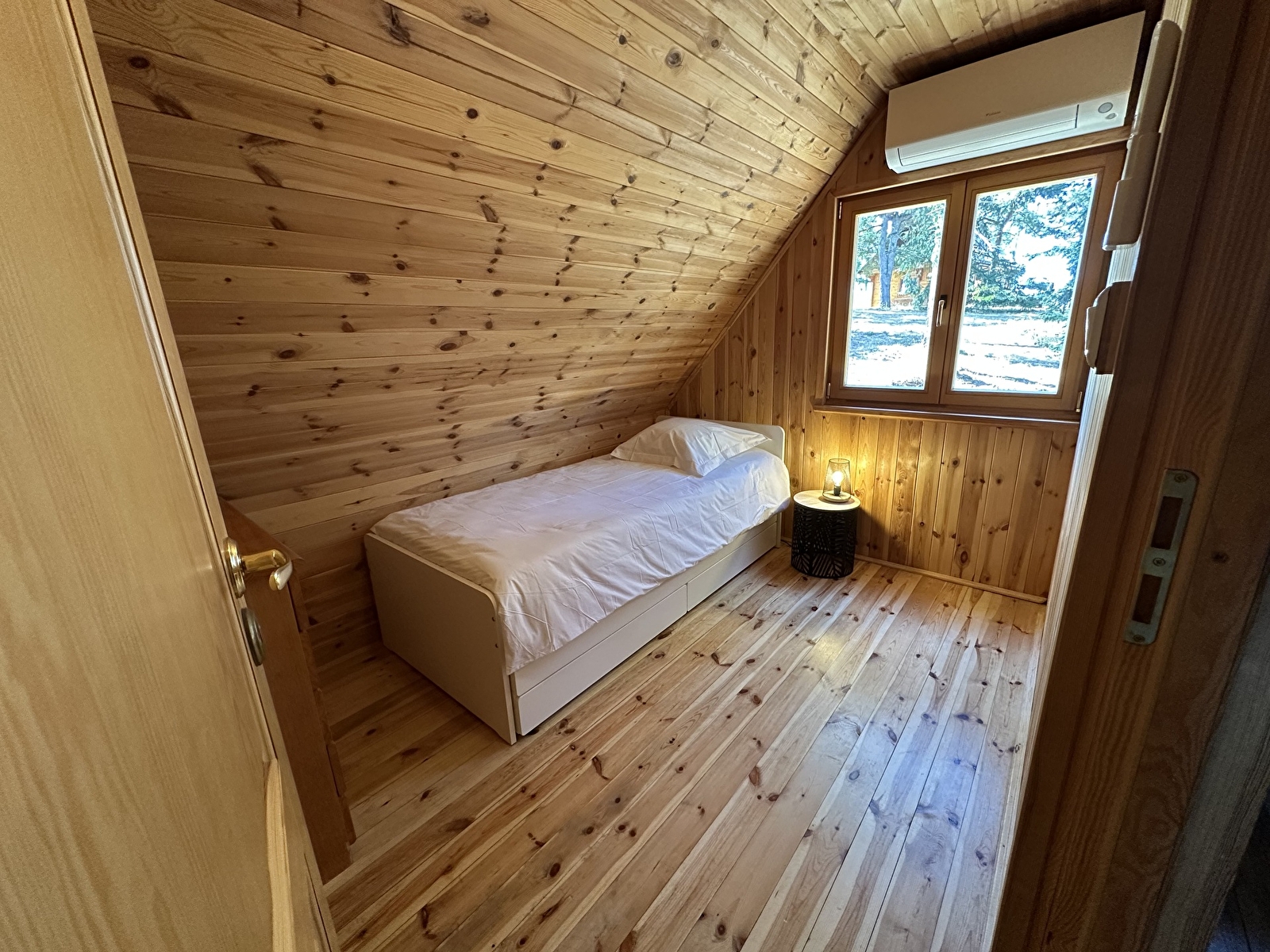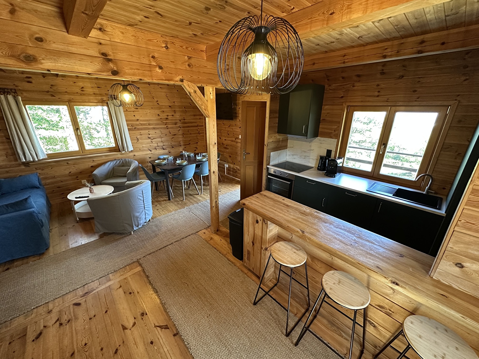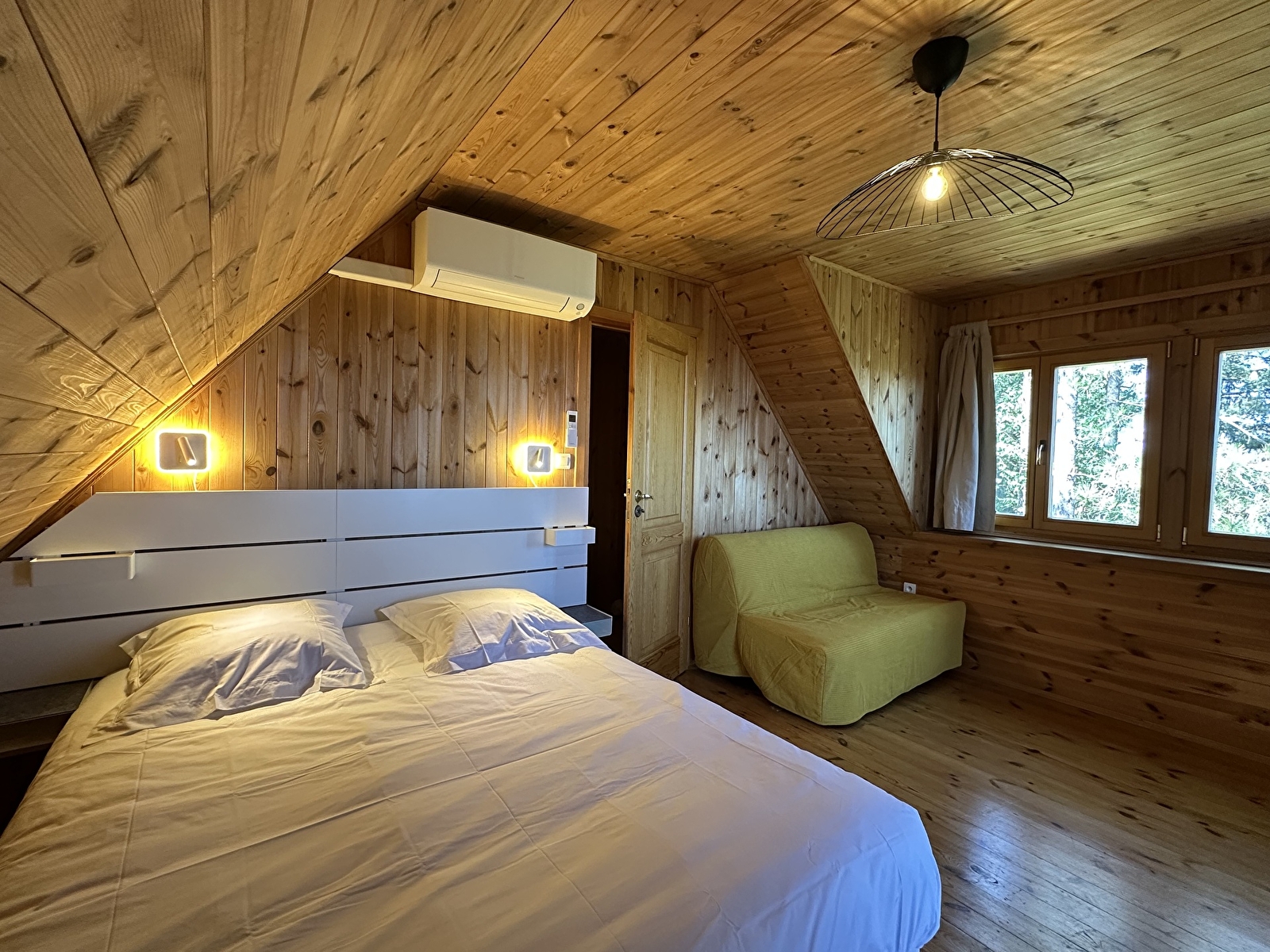 À 5 minutes à pied du Parc des Combes et en voiture du centre-ville, au cœur de la nature... Totalement dépaysant : un chalet (capacité 8/10 personnes) dominant la vallée, panorama portant à 30 km et parfois sur le Mont-Blanc. Chalet indépendant comprenant au rez-de-chaussée, un séjour avec salon canapé convertible et TV, une cuisine américaine équipée (réfrigérateur/congélateur, micro-ondes, plaque à induction, four, lave-vaisselle, cafetière Nespresso, fer et table à repasser), 1 chambre (1 lit de 160x200 cm pour 2 personnes), salle d'eau avec douche, machine à laver et WC. À l'étage : 2 chambres dont une avec balcon (1 lit de 160x200 cm pour 2 personnes, 1 canapé convertible et 1 lit tiroir pour 1 personne), salle de bain et WC. Climatisation réversible. Wifi. Terrasse équipée. Parc clos et arboré. Hébergement non fumeur. Nécessaire bébé mis gracieusement à disposition sur demande (lit bébé, baignoire, chaise haute, matelas à langer). Gare TGV à 15 minutes. Paris à 1h20. Formule tout compris : linge, draps, ménage avec entrée au Parc des Combes. Options : petit déjeuner, raclette ou barbecue.