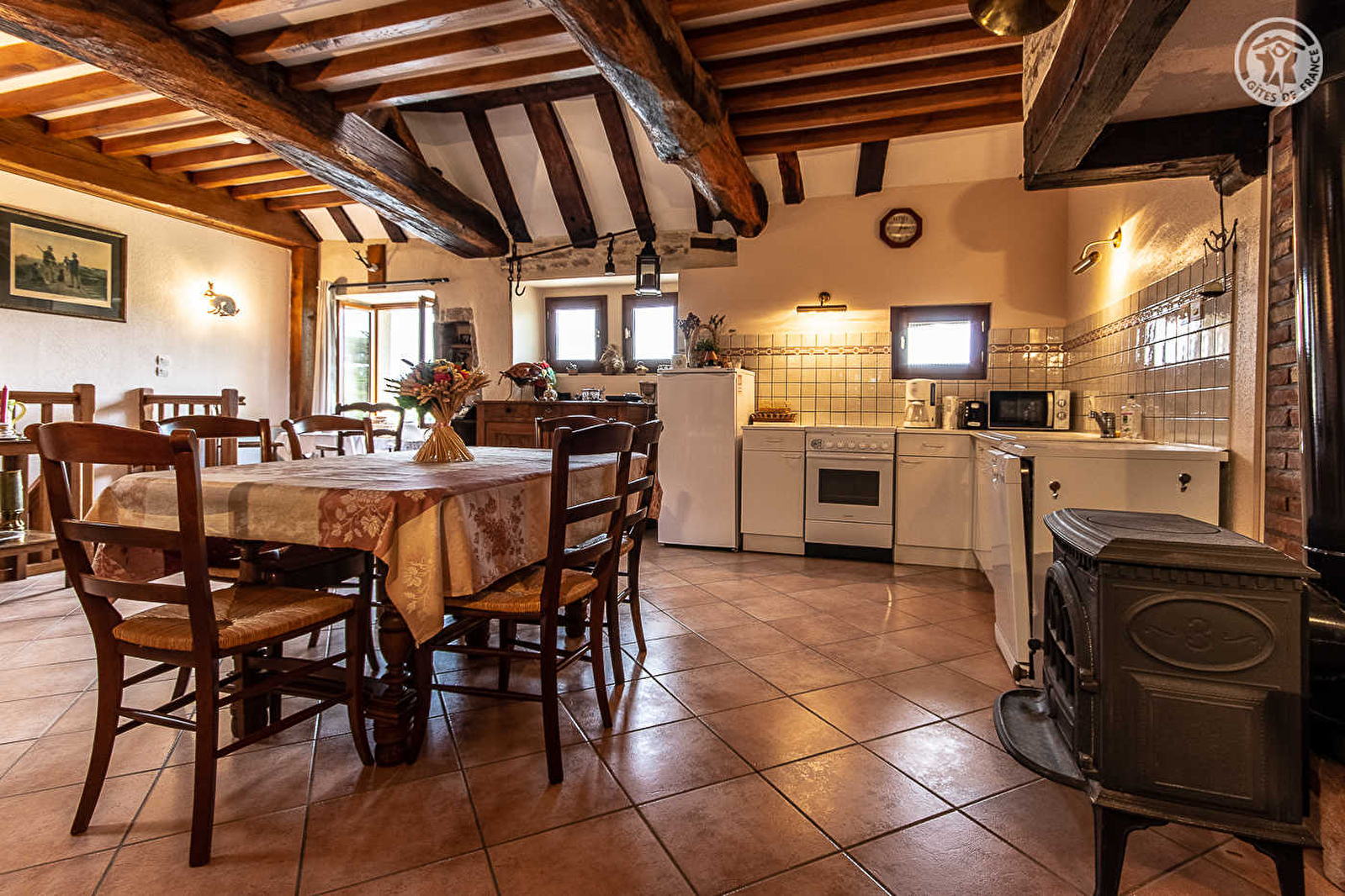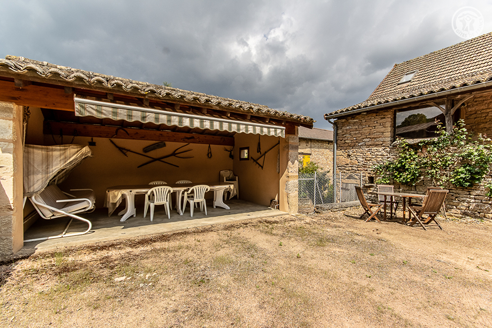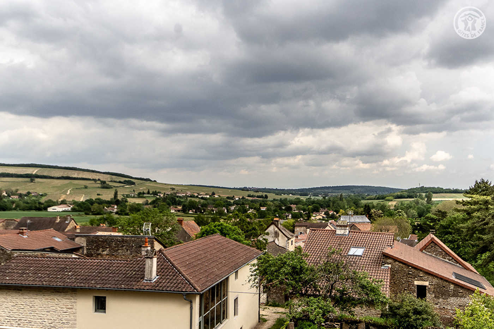 Authentique maison de pays du 17ème siècle intégralement restaurée (l'une des plus anciennes maisons datée des lieux) sise en impasse à flanc de coteau exposé et lisière de forêt, sur un promontoire panoramique dominant un joli vallon, voisinant le château d'Aine (19ème siècle) et son parc classé très réputé de 17 ha (doté d'un riche arboretum). Au creux d'un pittoresque hameau calme et typique du haut mâconnais lové sur les contreforts du massif sud Bourgogne au cœur même du vaste vignoble du célèbre AOC Mâcon. Magnifique cadre champêtre vallonné entre plaines et collines boisées, alternant coteaux de vignobles, forêts et prairies. A 1.5 km du charmant bourg viticole et commerçant d'Azé, ravissant village préservé doté d'un riche patrimoine historique (église romane, halles du 19ème siècle, châteaux, lavoirs, tours, moulins, belles maisons historiques…), de nombreux chemins bucoliques de randonnées, abritant les célèbres Grottes éponymes (site préhistorique classé avec musée réputé pour ses exceptionnels vestiges d'ossements d'ours des cavernes). Gîte de bon confort. Chaleureux cachet campagnard allié à une restauration patrimoniale soignée (poutraisons et charpente, linteaux de fenêtres en pierres & bois, pierres d'évier, bénitier… d'origine). Agréable ambiance dépaysante d'une ancienne demeure chargée d'histoire. Cour et large terrasse abritée avec balancelle complétée par un intimiste petit-balcon terrasse abrité en galerie. Belle vue dégagée sur la campagne et les vignobles environnant. Splendide panorama & paysages.