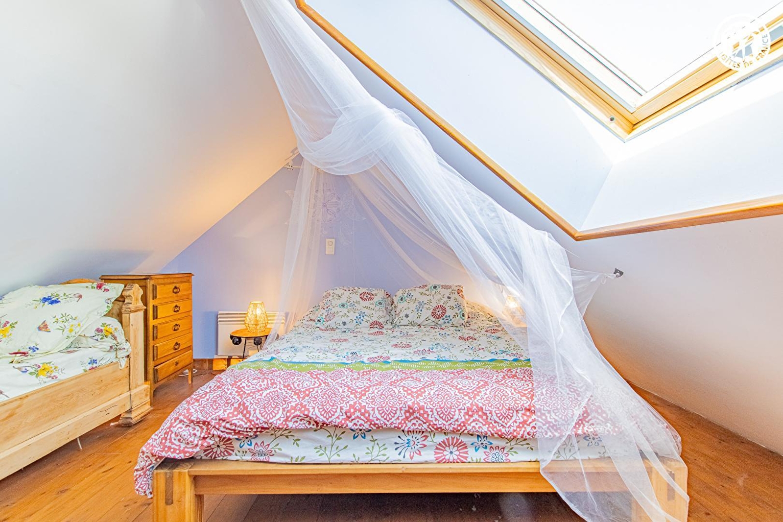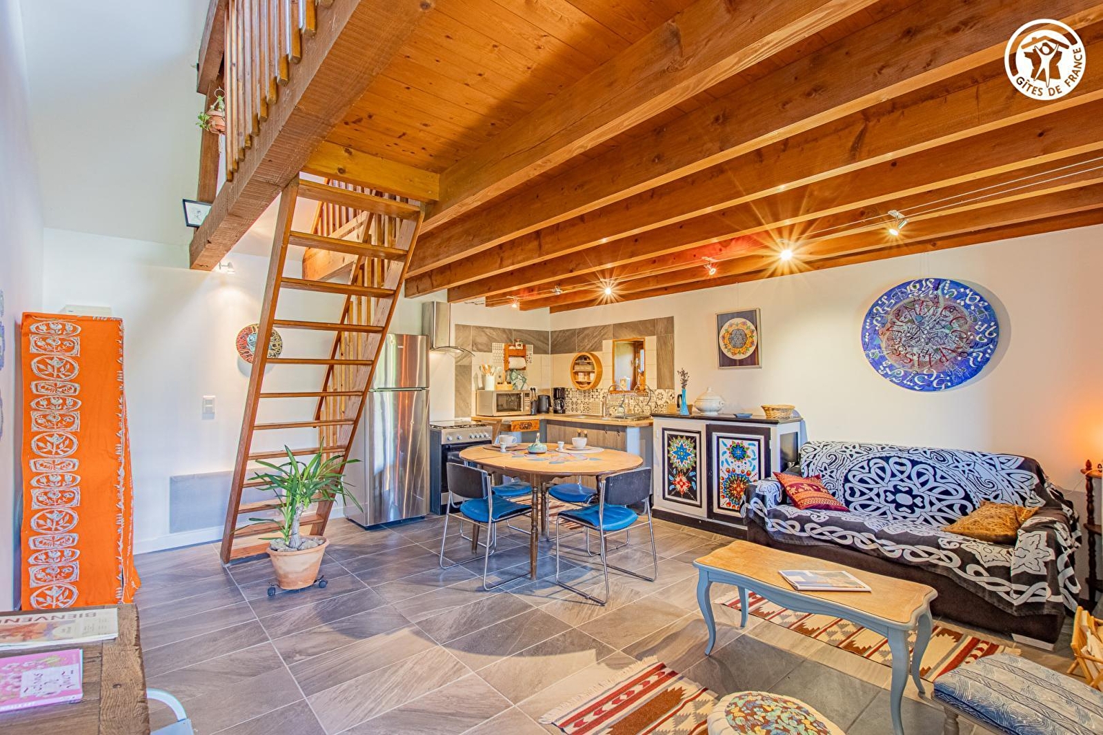 Composition : Maison individuelle jouxtant la maison des propriétaires (indépendance totale) sur une propriété close. Chauffage électrique. Gîte en duplex. Rdc : séjour-cuisine-salon (canapé convertible 1 p. 130x180cm en appoint), salle d'eau (douche/Wc). 1er étage : chambre en mezzanine (lit 2 p. 160x200cm). Terrasse + mini terrasse abritée + jardin clos (250m²) + local vélos + parking privatifs. Supérette à 7 km. Supermarché & petits commerces à 10 km. Toutes commodités à 19 km.