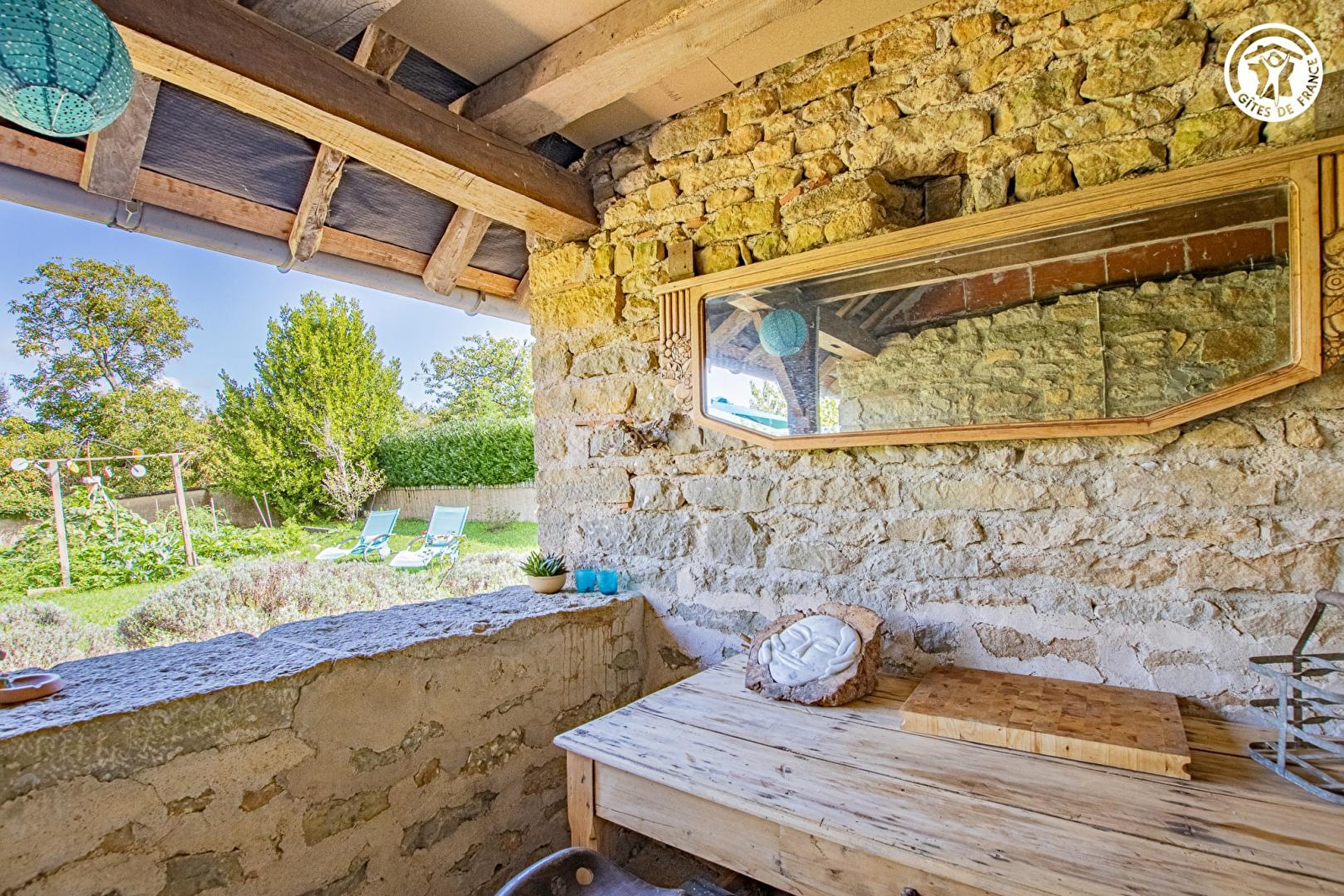Tous deux passionnés d'art et de nature, Anne & Bernard vous ouvrent les portes d'une authentique grande traditionnelle datant du XIXème siècle, ravissante "maisonnette" restaurée & revisitée en dépaysante villégiature, blottie au calme au sein d'un pittoresque petit hameau rural résidentiel au charme d'antan. Absolue tranquillité en pleine campagne préservée, à parcourir lors de relaxantes balades à pied ou VTT, lové au cœur du magnifique bocage local (où paissent les paisibles & célèbres vaches charolaises), au creux de la verdoyante vallée de la Guye (& sa rivière poissonneuse) sur un espace protégé en ZNIEFF pour ses richesses faunistiques & floristiques. Magnifique écrin paysagé alentour, conjuguant champs de cultures & prairies boisées, coteaux de vignobles et belles forêts sauvages. Cadre champêtre & naturel enchanteur & 100% reposant. Spacieux gîte de bon confort. Doux cachet campagnard d'esprit brocante & "bohème" dialoguant avec une atypique "déco" d'inspiration "mandala" réalisée par la propriétaire (élégantes peintures murales, meubles peints & tableaux). Chaleureuse chambre "cocon" lové sous les toits en esprit "cabane". Large terrasse exposée (que complète une appréciable mini terrasse abritée) ouverte sur un agréable jardin clos fleuri de 250m², parsemé des sculptures en pierres du propriétaire, offrant un insolite jardin potager "mandala" exploité en permaculture (aménagé en cercle & riche de nombreuses plantes vivace / cueillette possible avec l'accord des propriétaires).