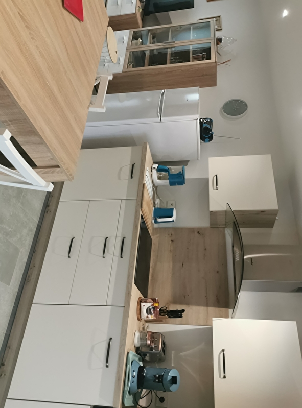 Cuisine équipée ouverte sur salon (télévision, plaque de cuisson, four, réfrigérateur avec compartiment congélateur, micro-ondes, lave-vaisselle, hotte, cafetière, théière, grille-pain ... ).