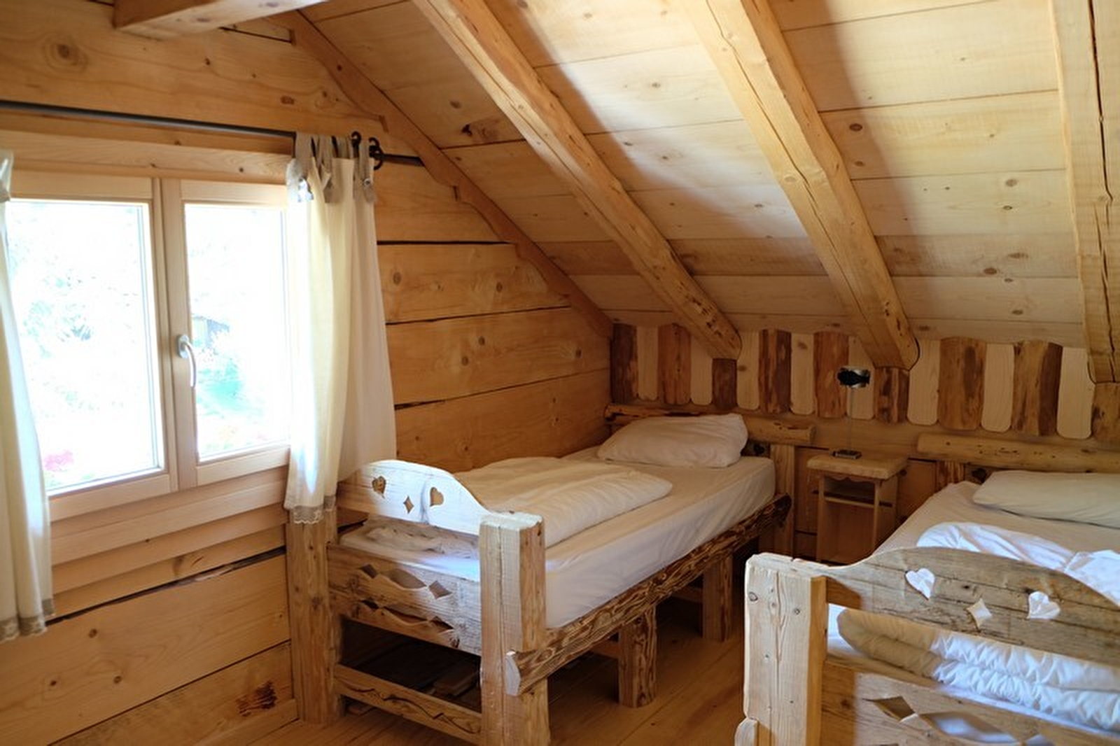 Chalet authentique, indépendant, avec vue sur la nature environnante, bénéficiant d'un bon ensoleillement. La décoration style montagne fait tout le charme de cet hébergement. Au RDC : séjour-salon avec TV écran plat, lecteur DVD, wifi, coin cuisine aménagée, salle d'eau. A l'étage : CH1: 1 lit 2 places, CH2: 2 lits 1 place. Chauffage électrique au sol, terrain attenant non clos avec trampoline et balançoire, balcon sud. Toutes charges comprises. Location de draps: 10€/la paire. Chaque lit est équipé de couette: prévoir drap housse, taie d'oreiller et housse de couette. Caution ménage demandée à votre arrivée : 60 euros