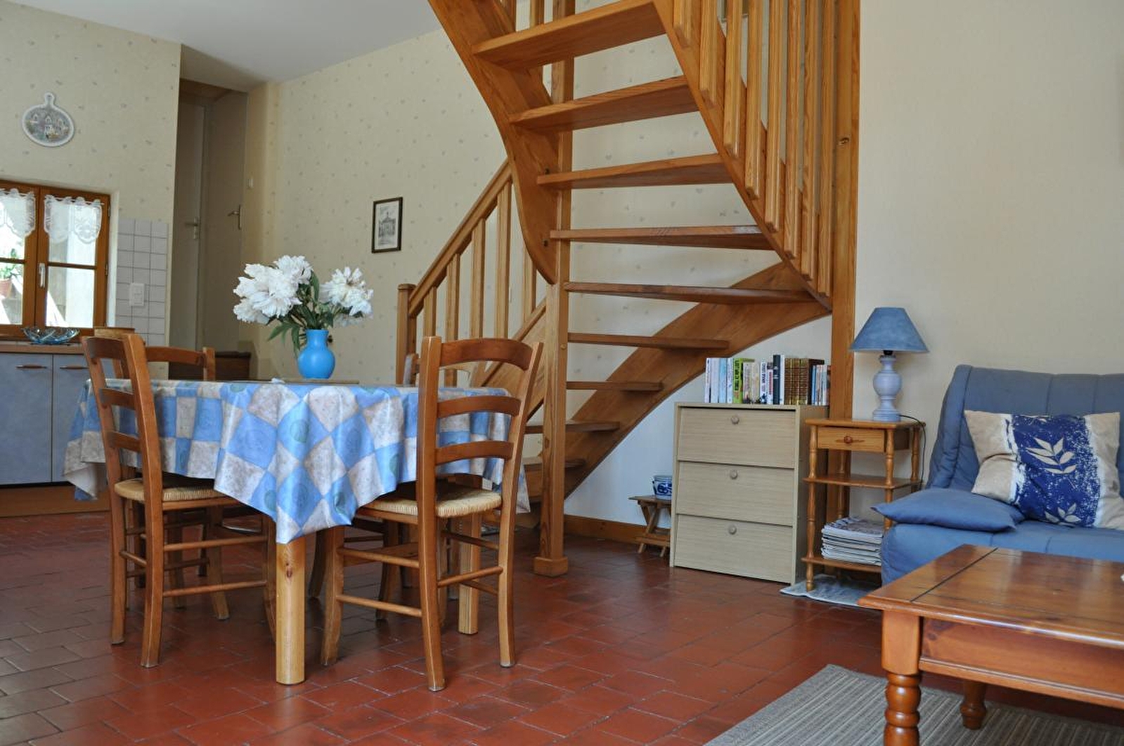 Rez-de-chaussée: séjour avec cuisine équipée ouverte sur coin-repas et salon; salle d'eau, WC.