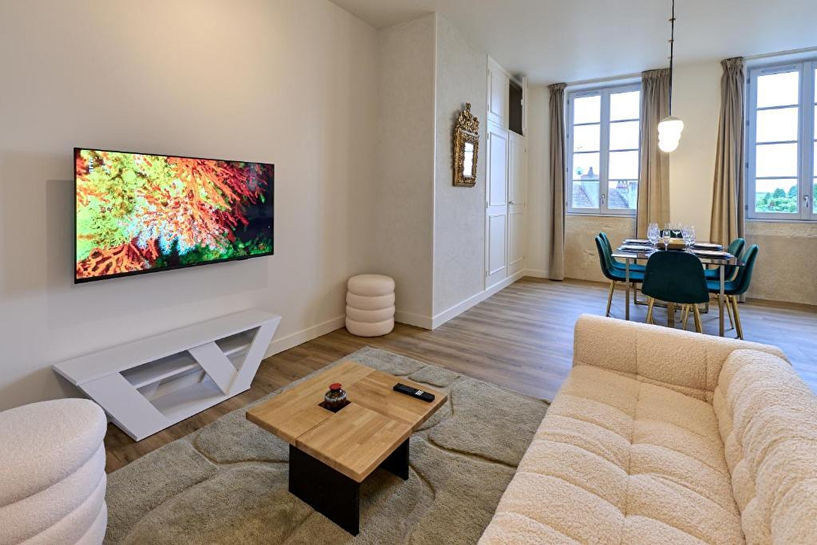 Convivial et tout équipé, ce logement haut de gamme, vient d'être aménagé dans l’esprit d’un appart-hôtel privatif. Son emplacement est idéal pour se rendre n'importe où dans Nevers et très rapidement. Ce logement, entièrement refait à neuf, est situé au deuxième étage SANS ascenseur dans une résidence privée extrêmement calme et lumineuse. Le quartier est très safe.L’appartement peut accueillir jusqu’à 6 personnes. Il dispose de 3 chambres équipées chacune d'un lit King Size . Le logement dispose de deux salles de bain, dont une parentale.