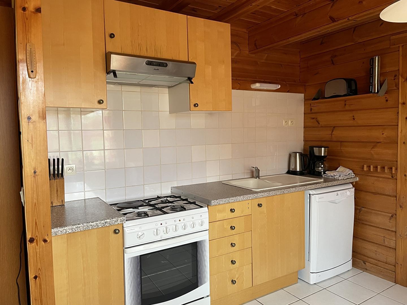 Dans un cadre naturel, chalet bois (SAPIN) entièrement neuf et indépendant, situé sur un terrain comportant 4 autres gîtes. Cuisine intégrée toute équipée (micro-ondes), salon-séjour (poêle à bois) avec de grandes baies vitrées ouvrant sur la terrasse, salle d'eau (douche hydrothérapie et sauna finlandais pour 4 pers), ch1 1 lit 2 pl, buanderie (sèche-linge). A l'étage : salon en mezzanine (canapé-lit 2 pl), ch2 : 1 lit 2 pl + 2 lits 1 pl superposés. Chauffage électrique. Terrain attenant non clos, salon de jardin, barbecue. Prestation ménage à 60 €. Piscine, tennis et terrain de jeux municipal à 100m.
