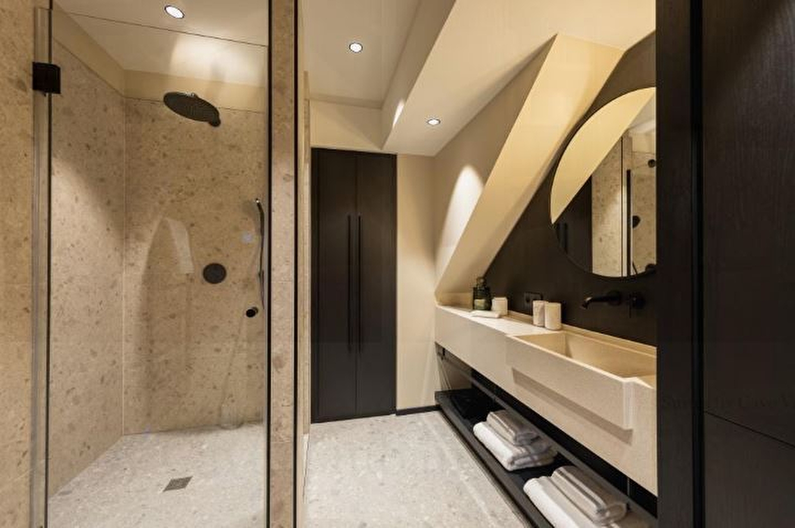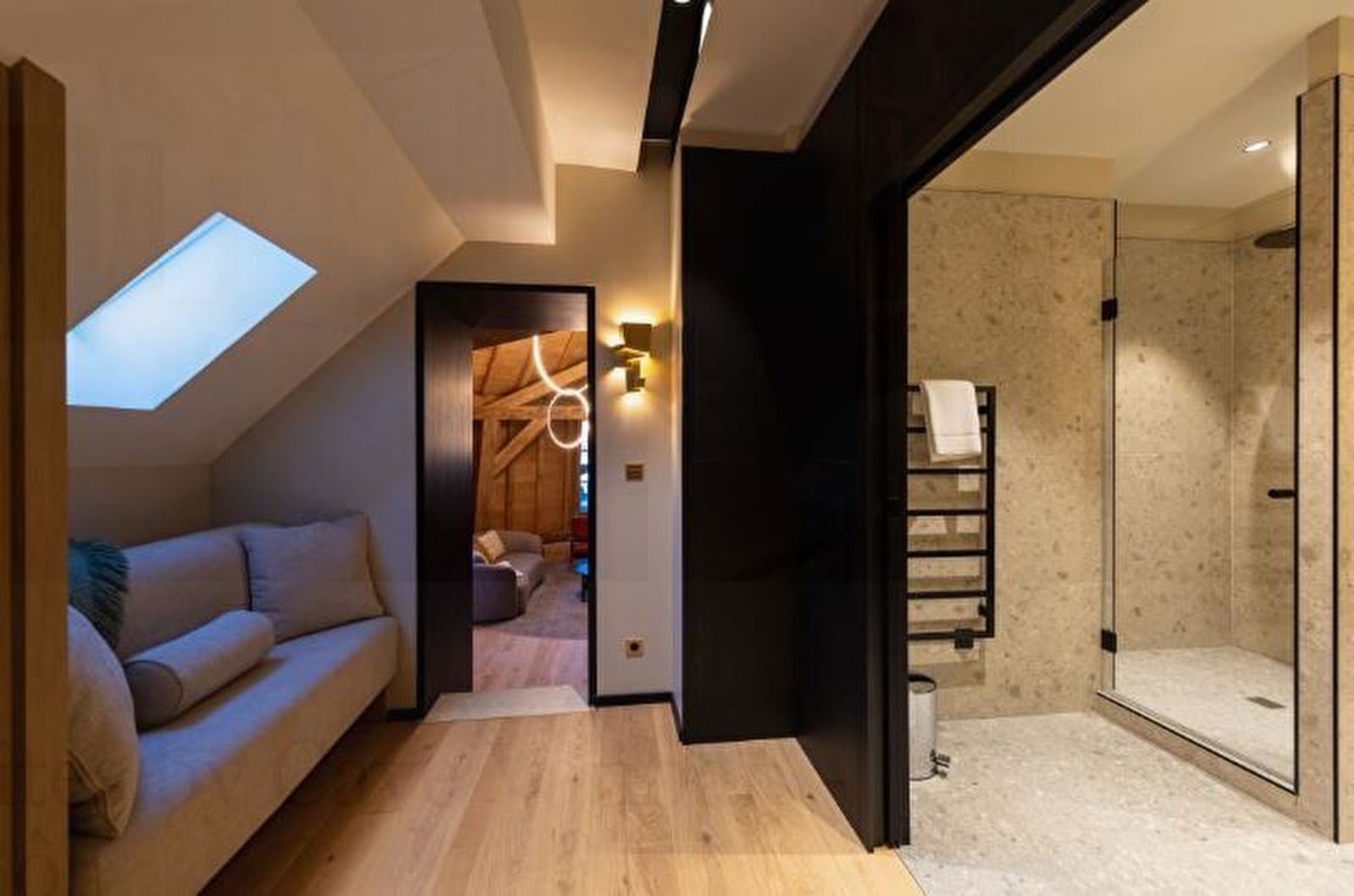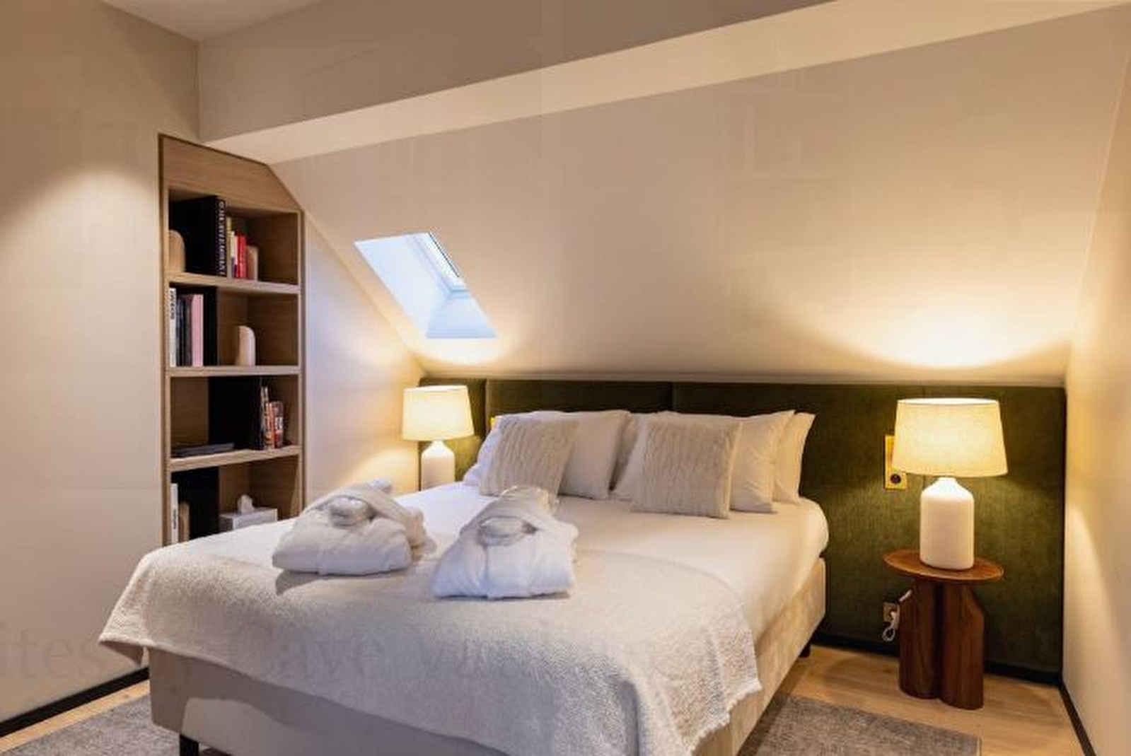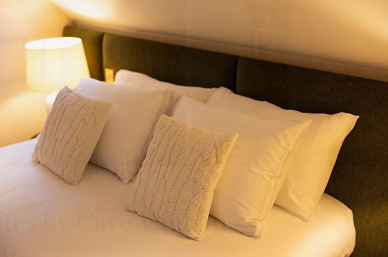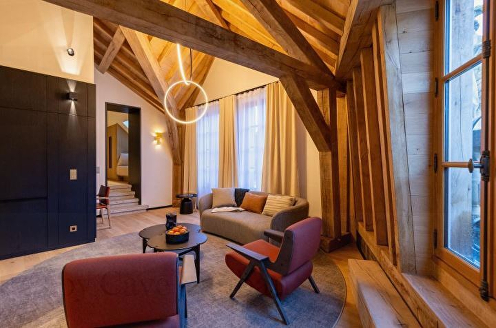 Nichée au sein d’un bâtiment historique métamorphosé par le talent d’un architecte, la Suite Bô déploie ses 80 m² dans une harmonie subtile de matériaux nobles et de poutres apparentes en bois. Ce lieu d’exception conjugue avec finesse charme intemporel, confort moderne et atmosphère chaleureuse.