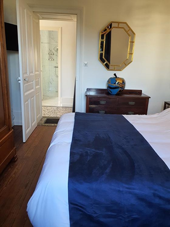 Appartement de standing, neuf, climatisé, 550 m des Thermes. Séjour canapé réversible + fauteuil relaxation. Chambre avec TV. Cuisine indépendante. Parc d'agrément aménagé clos. Parking et garages privés.