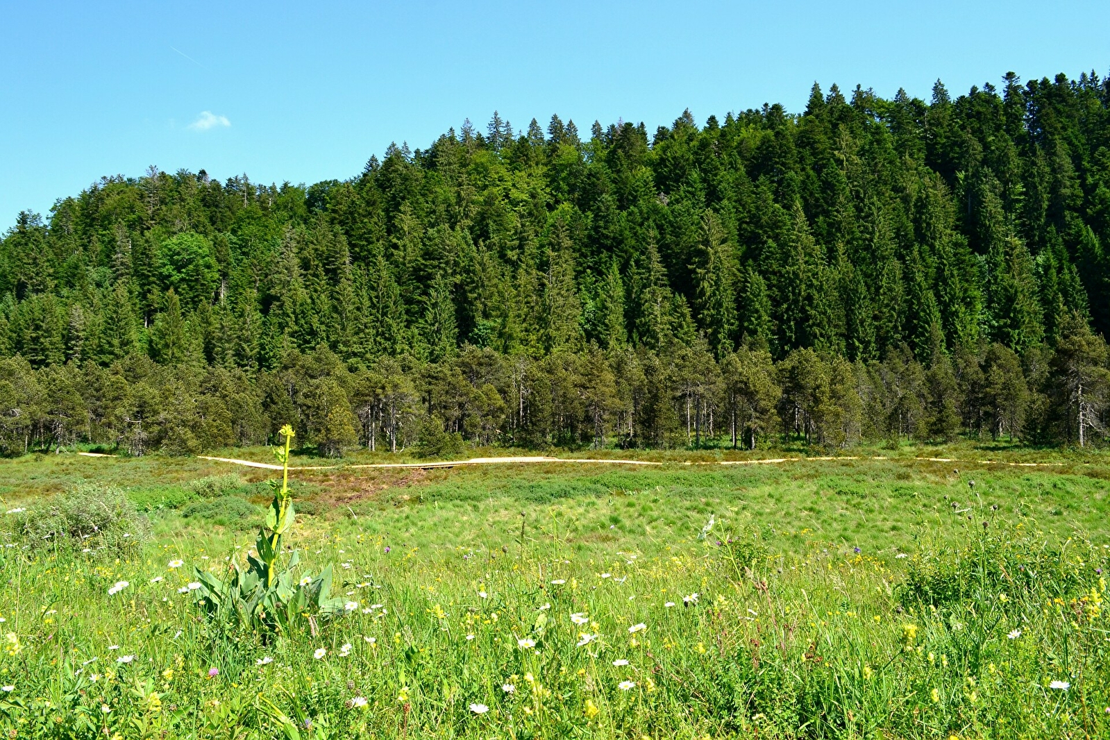 Un circuit sans difficulté au départ de Prénovel qui permet d'accéder à la tourbière de Nanchez aménagée, site naturel exceptionnel à découvrir en cheminant à pied sur son platelage.A la forêt de Prénovel, haute en verdure et clairsemée de clairières fleuries, succéde la combe ouverte de Nanchez dominée par l'activité agricole où s'étirent milieux humides et tourbières le long du Nanchez reméandré.Suivre le balisage n°83 vertItinéraire officiel - réseau Geotrek du Parc naturel régional du Haut-Jura