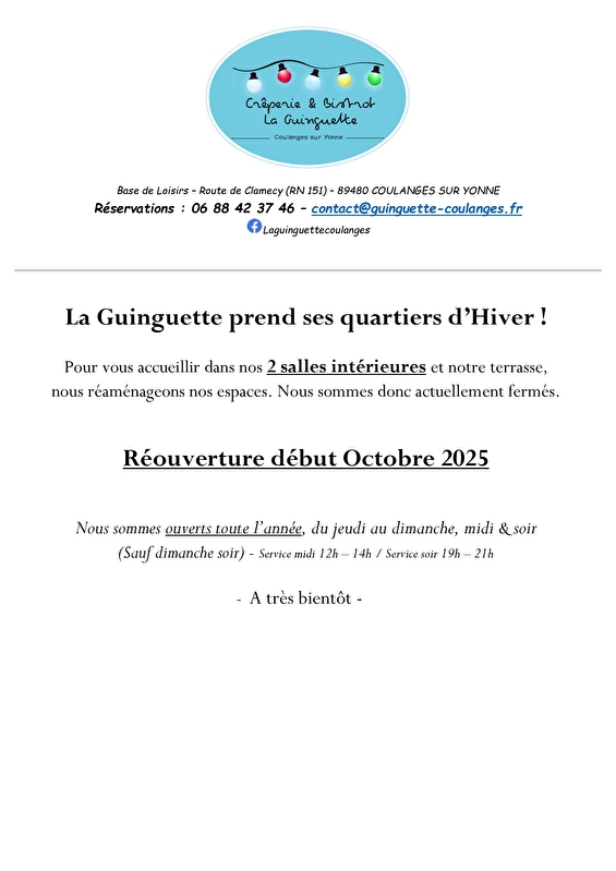 Au bord de l'eau, La Guinguette vous propose une carte Crêperie & Bistrot dans un espace convivial entre l'Yonne et le Canal du Nivernais.