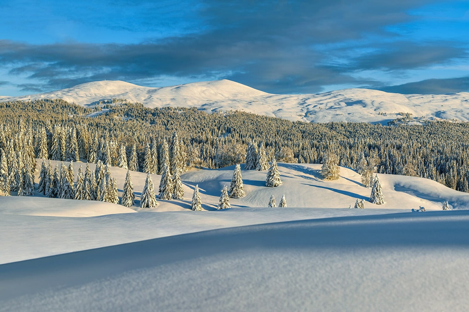 Traversée de la forêt du Risoux, par le belvédère de La Roche Bernard. Vue magnifique sur la combe de Chapelle des Bois. Lacs glaciaires, forêts d’épicéas, clairières magiques et vin chaud au chalet Gaillard ! Nuit à Bois d’Amont.