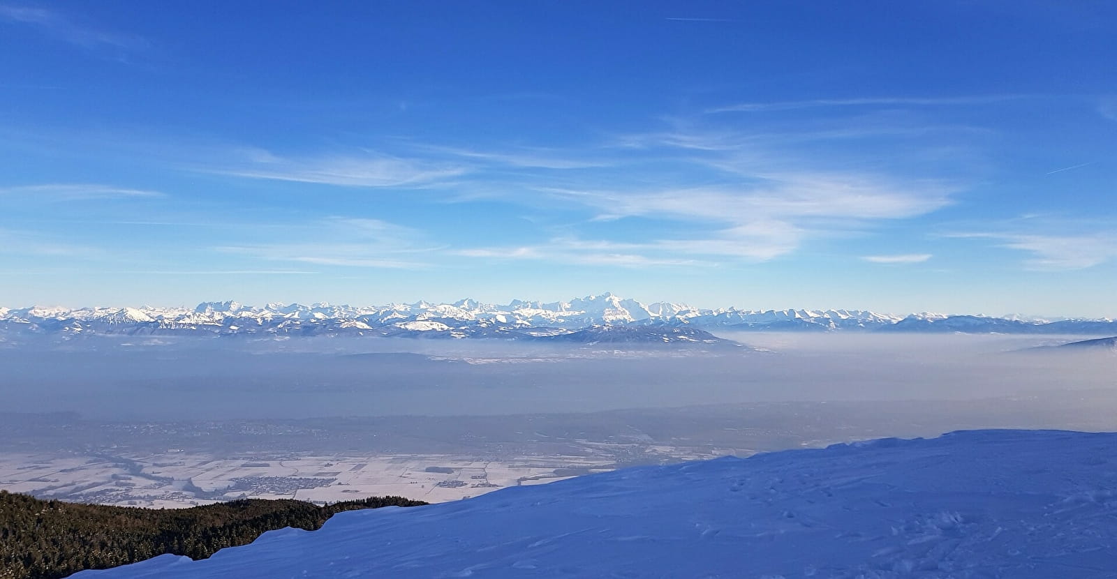 La Grande Traversée du Jura à raquettes : un itinéraire spécifique, adapté à ce moyen de locomotion ! Se faufiler entre 2 épicéas pour déboucher dans une clairière, vaste combe qui se prolonge au loin par la vue sur les Monts Jura. Reliefs qui s’adoucissent avec la neige.