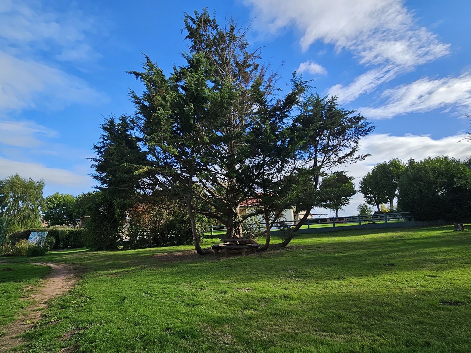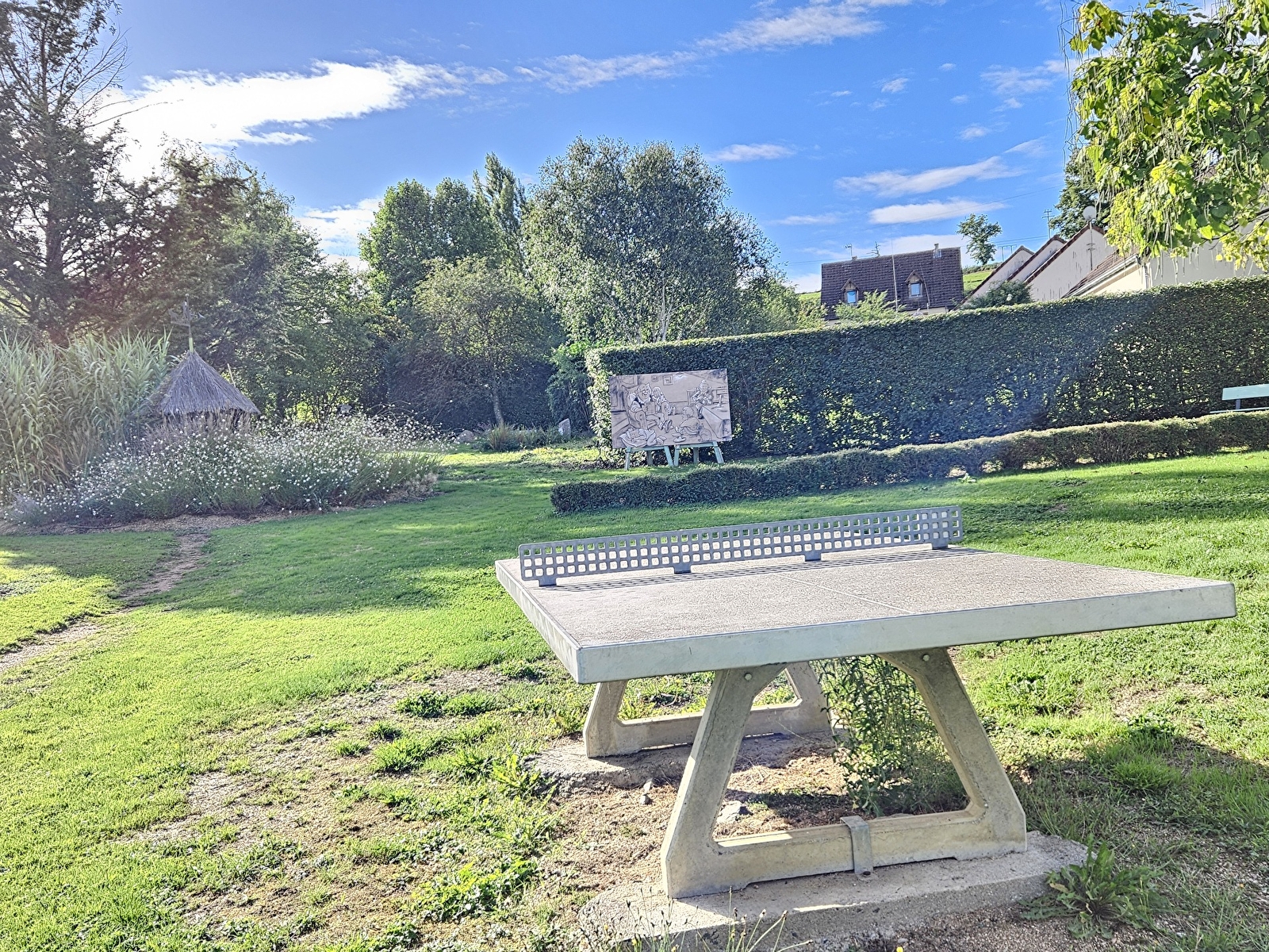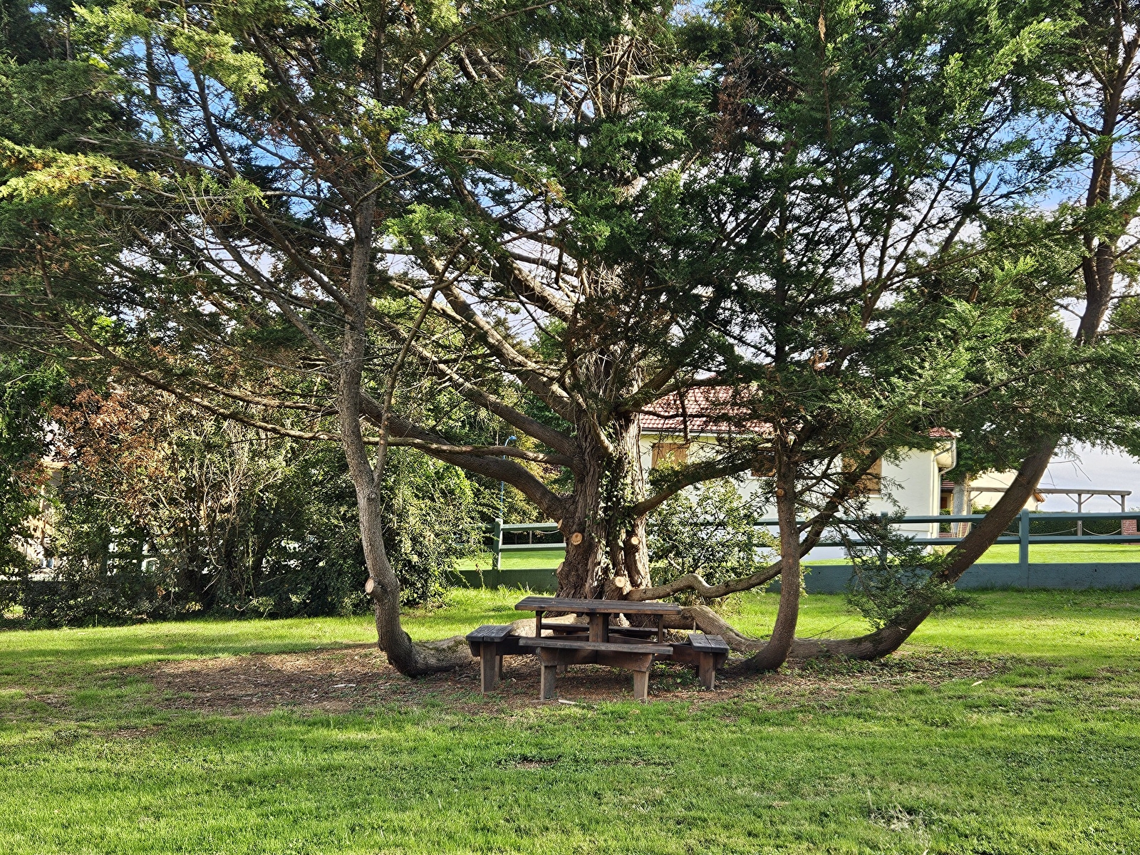Table de pique-nique ombragée dans un parc avec table de ping-pong.