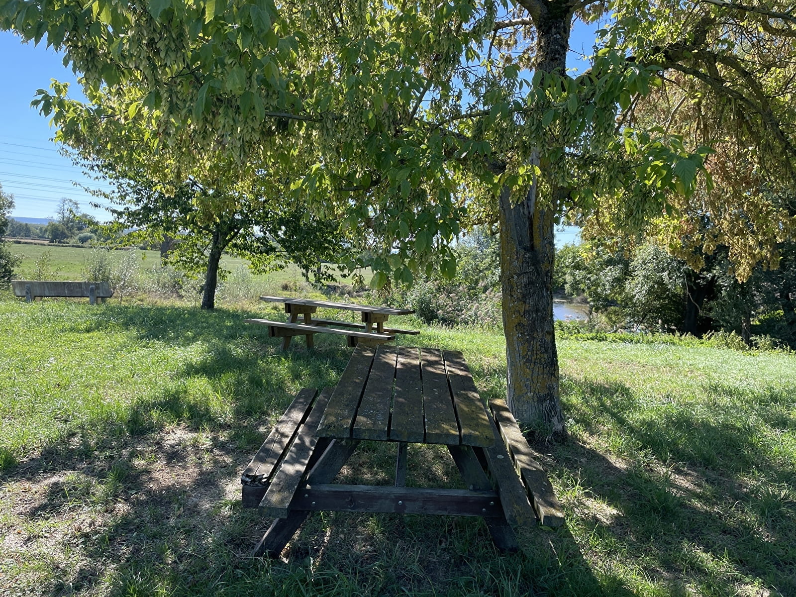 Aire de pique-nique idéalement située, en bordure de la Grosne, ombragée.