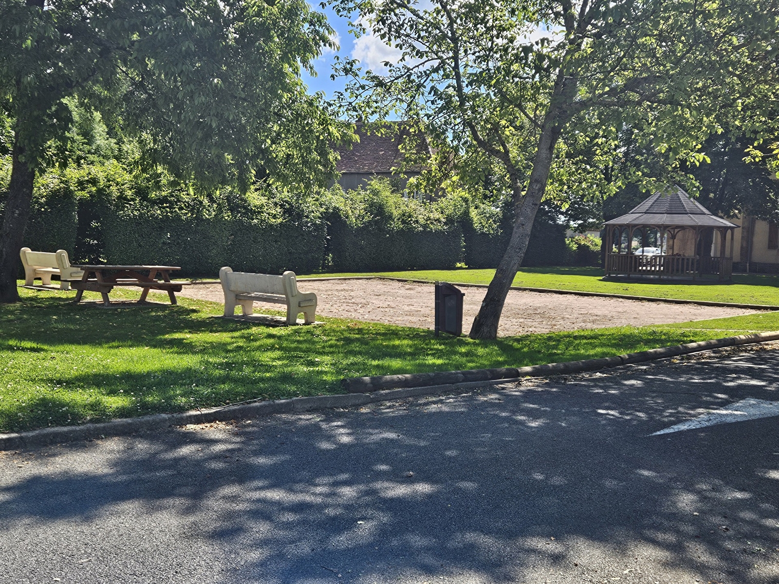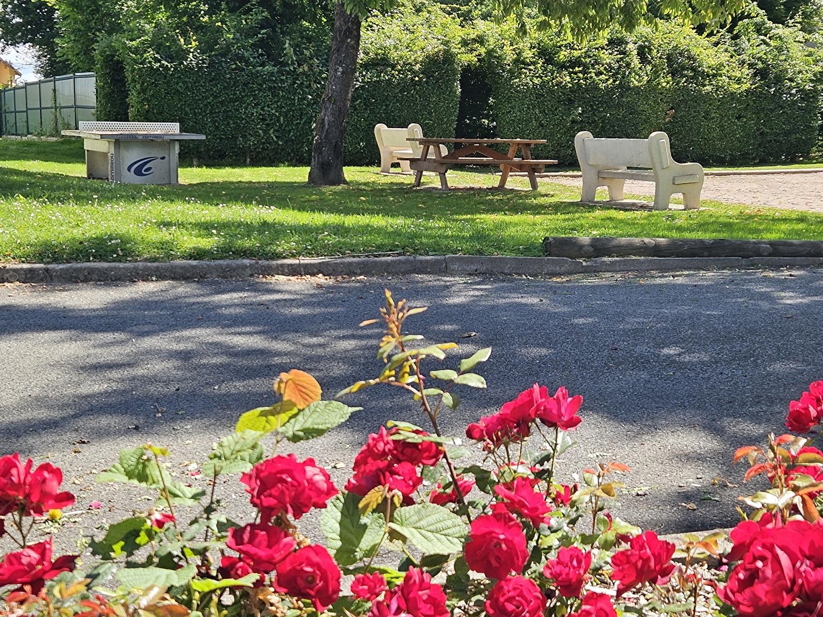 Aire de pique-nique ombragée à proximité d'un terrain de pétanque, d'une table de ping-pong et du city-stade
