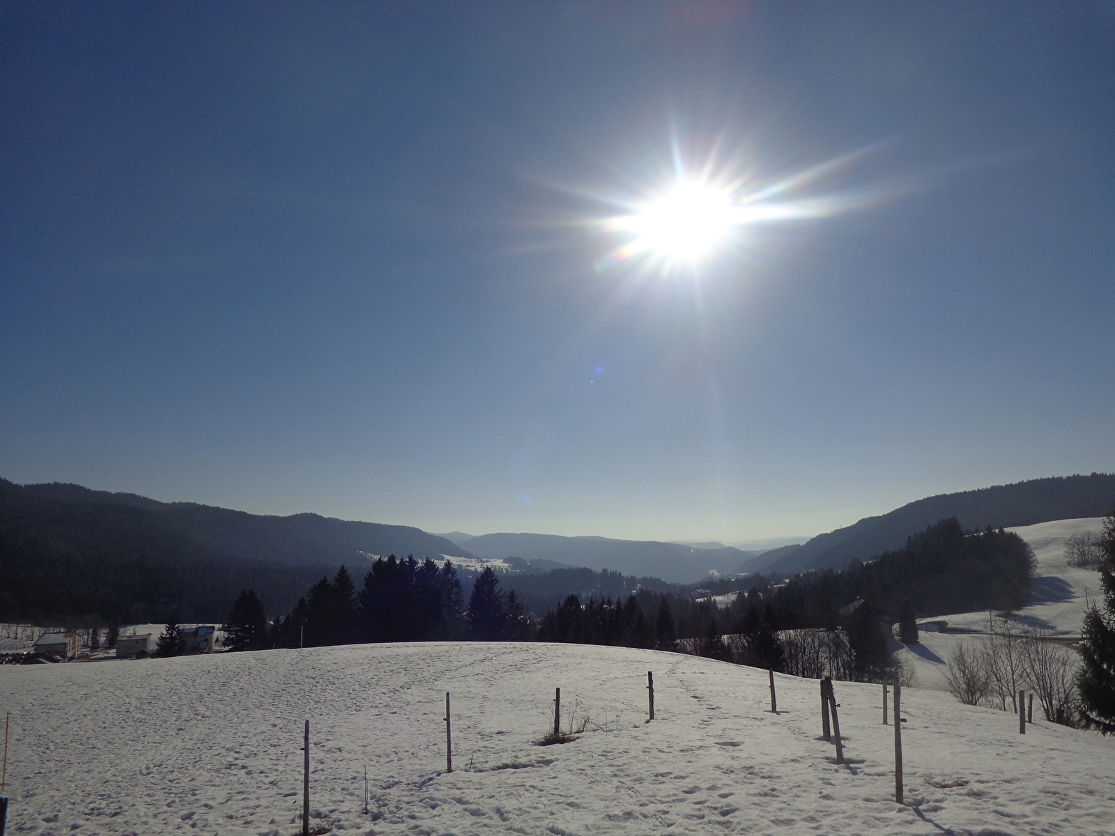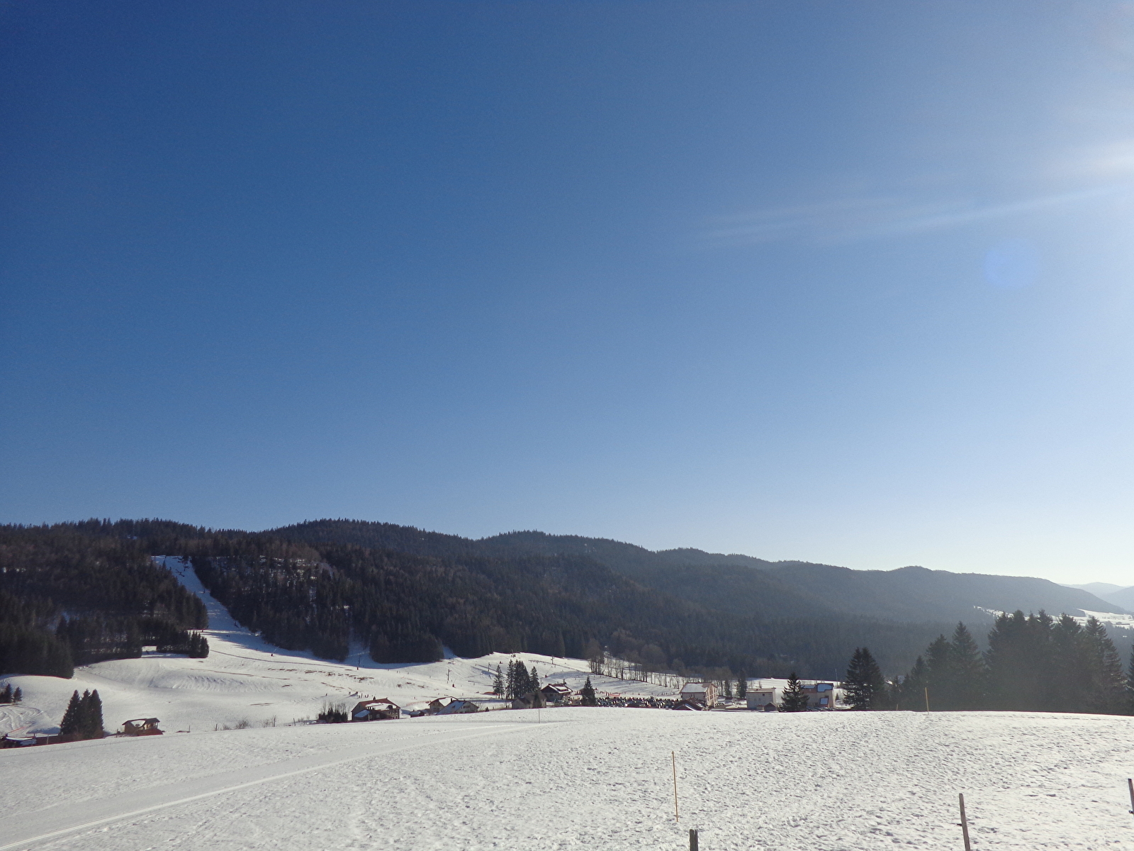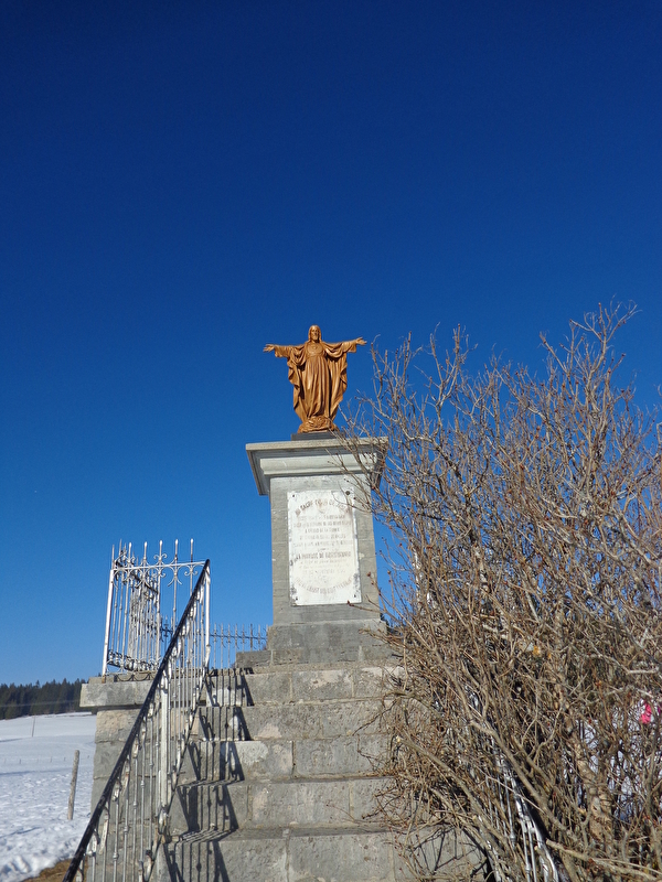 Situé sur l’arrondi d’une des petites collines formées par les dépôts morainiques, le Sacré Coeur domine la houle d’herbages et de boisements qui descend vers la cluse de Morez, au sud-ouest.