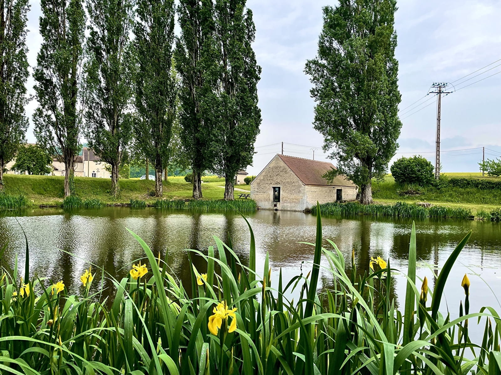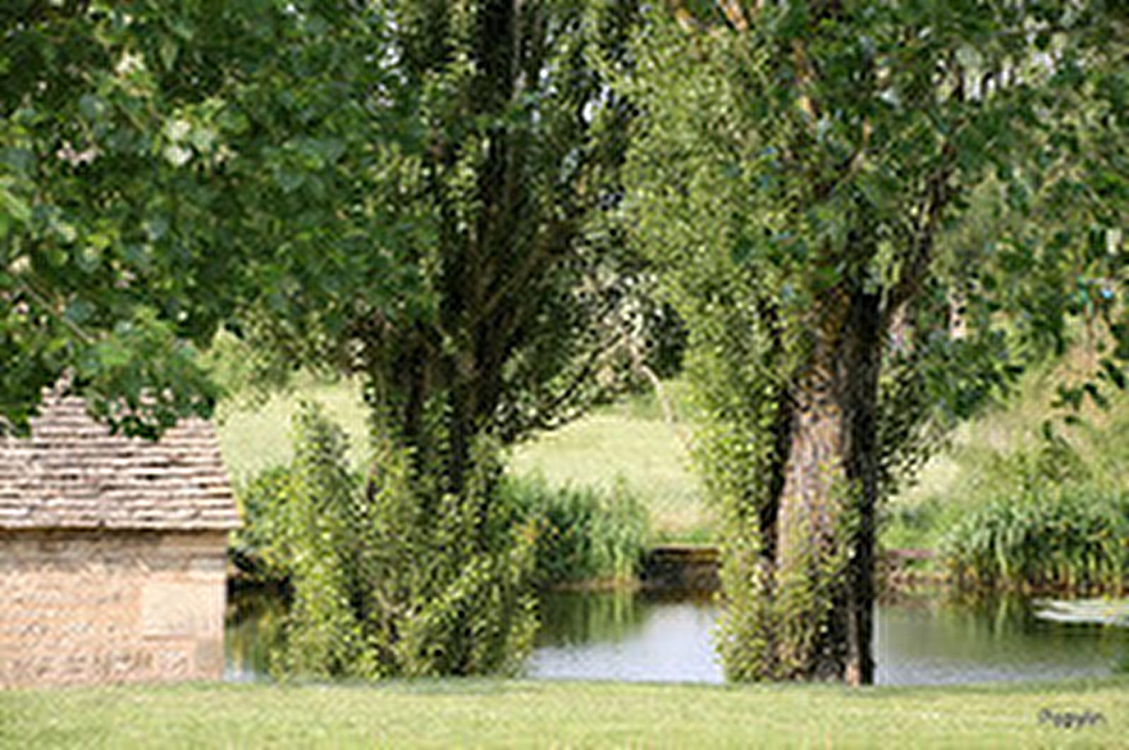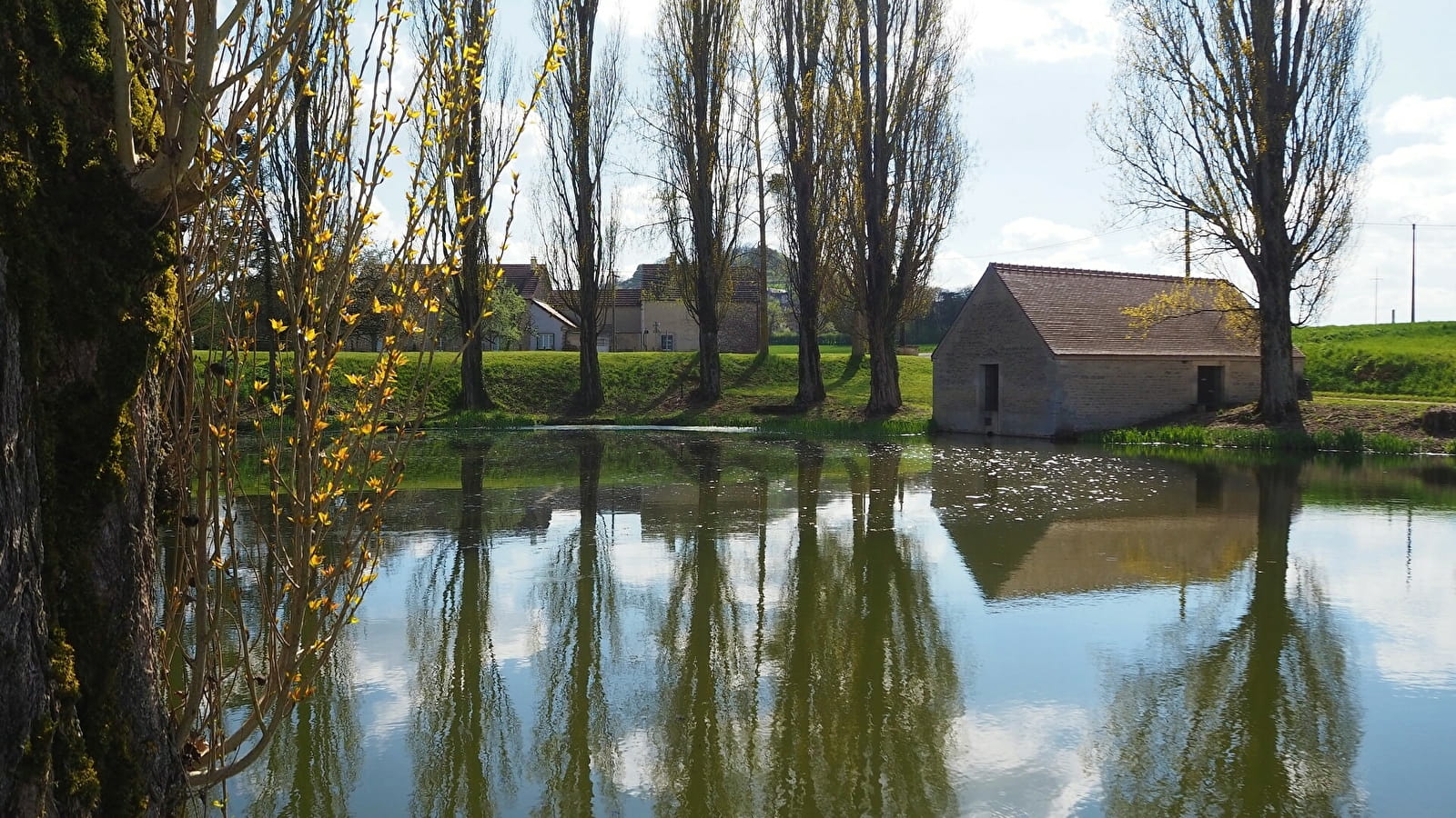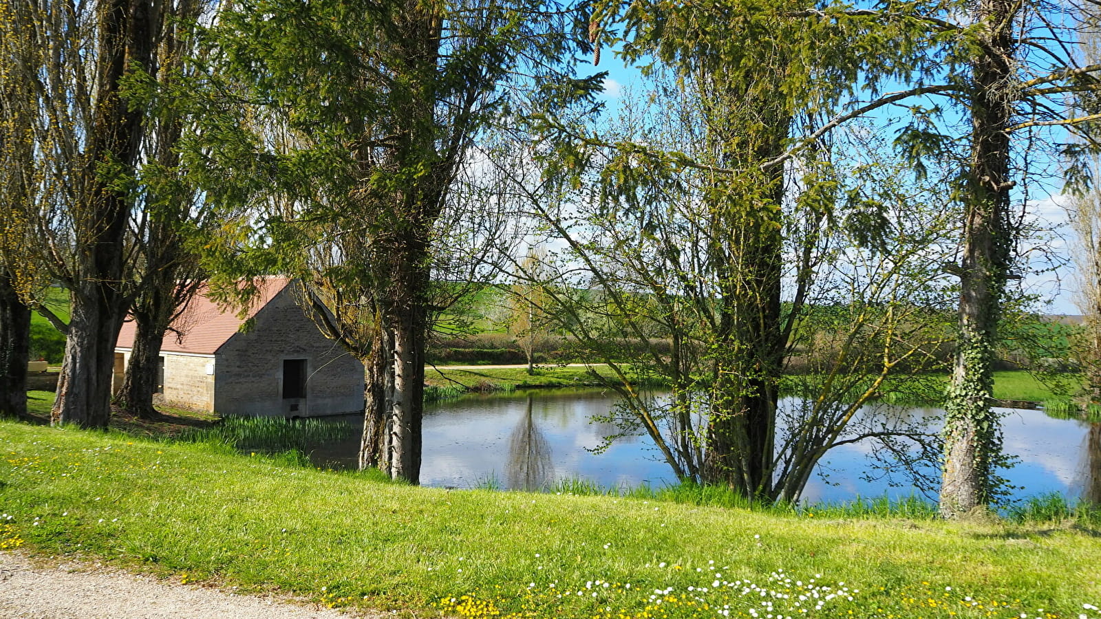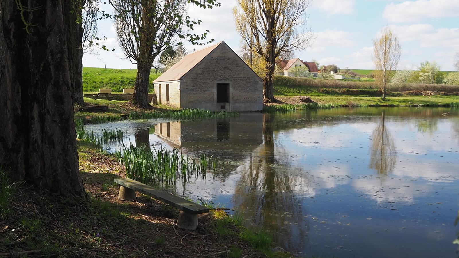 À Saulx-la-Ville, hameau de Saulx-le-Duc, un lavoir se mire au bord d'un étang, bordé d'arbres, de petits bancs en pierre et d'une table de pique-nique.