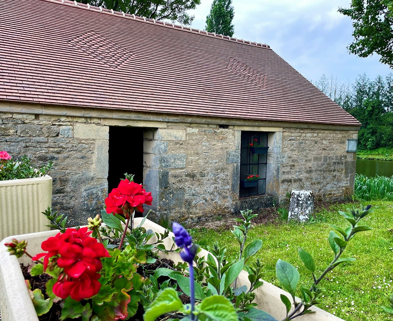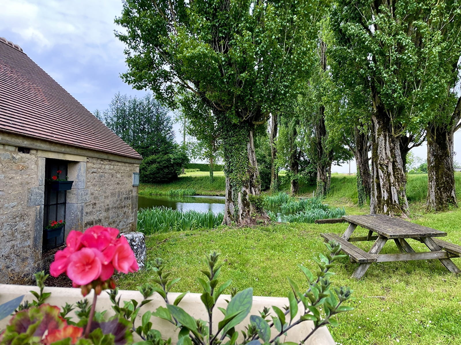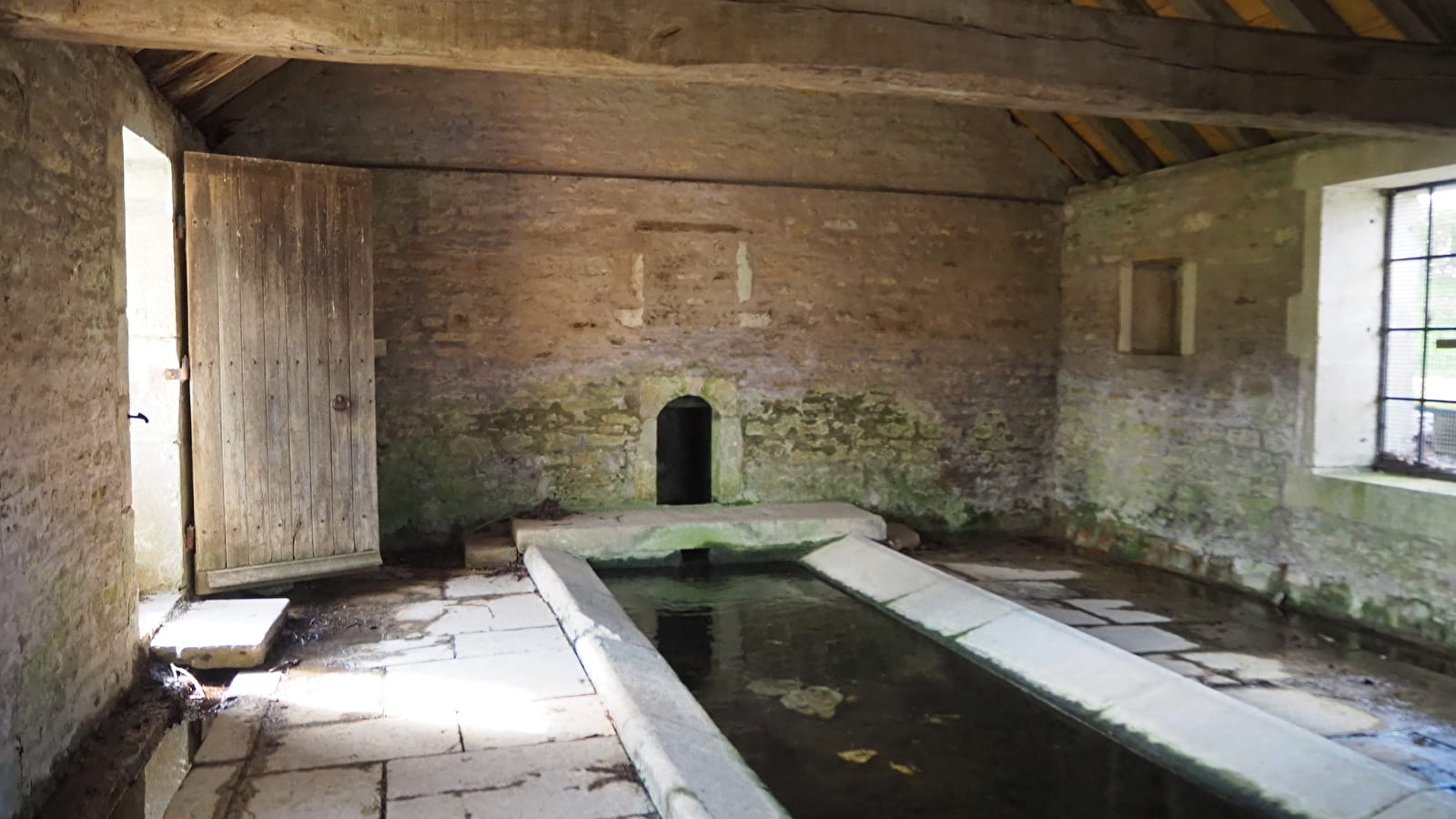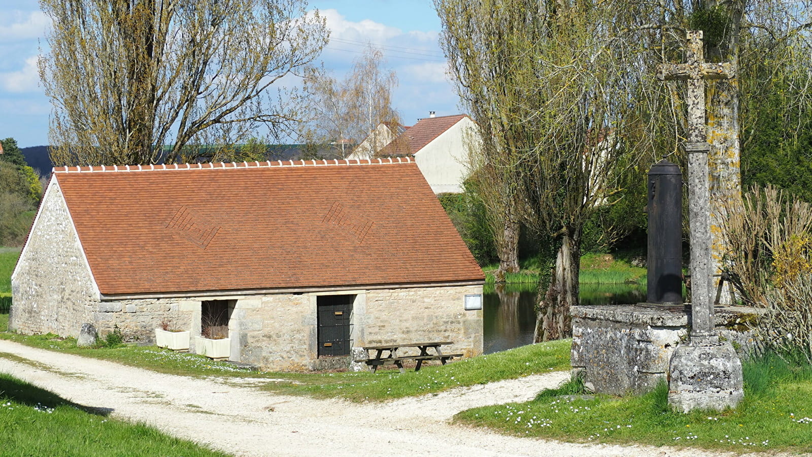 In Saulx-la-Ville, a hamlet of Saulx-le-Duc, a washhouse stands at the edge of a pond, lined with trees, small stone benches and a picnic table.