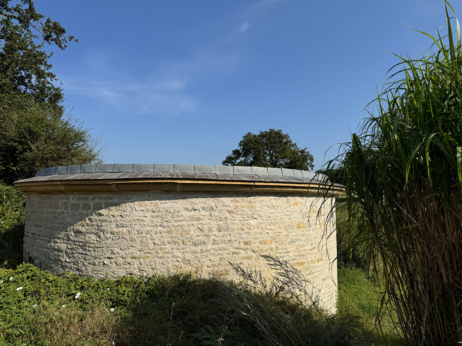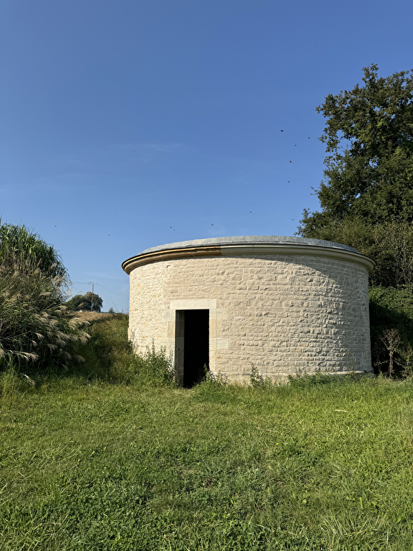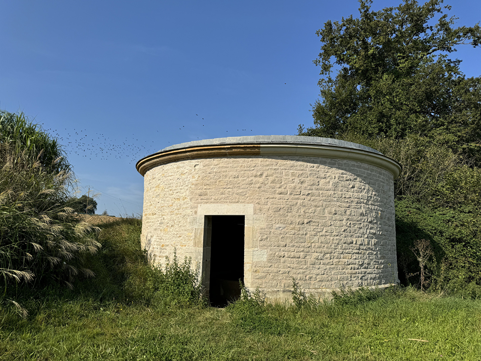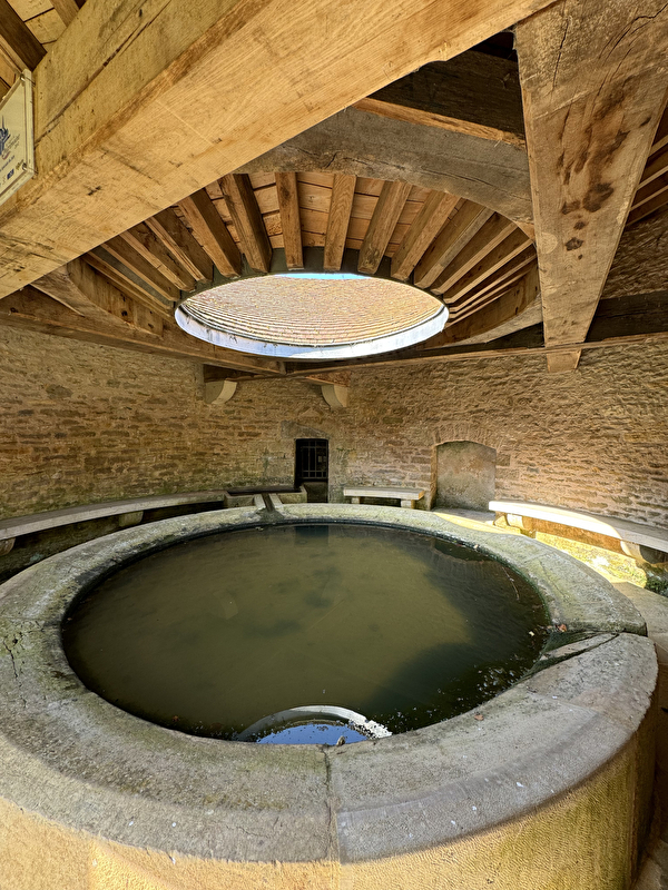Sa toiture conique inversée, permet de recueillir les eaux de pluie en plus des eaux de sources qui alimente le bassin circulaire.